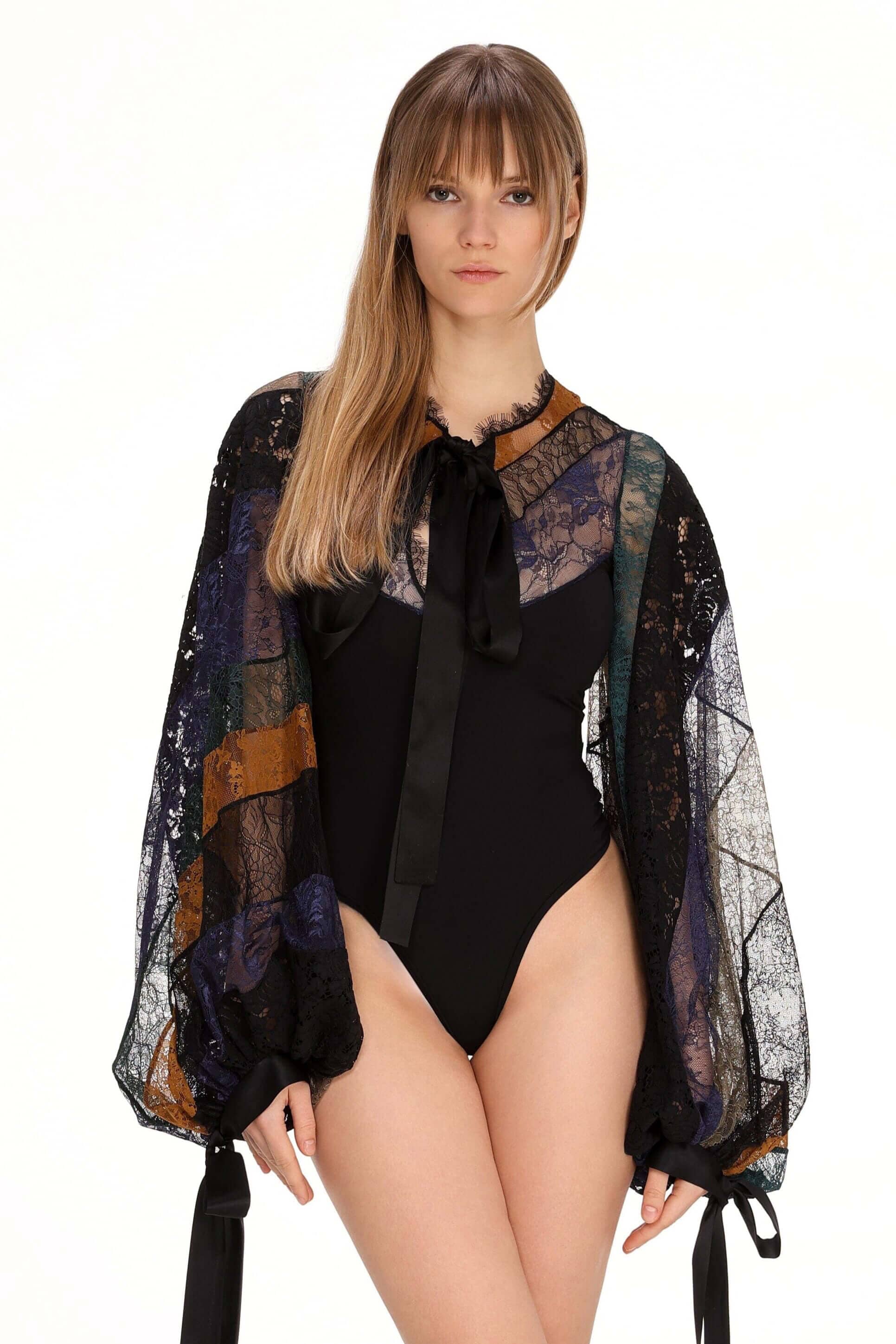 The bodysuit embodies romantic femininity, blending delicate charm with modern sophistication. Its figure-hugging silhouette accentuates the body with effortless grace, while the balloon lace sleeves add a touch of ethereal beauty. Satin ribbons delicately adorn the sleeves, creating a sense of movement and refinement with every gesture. Designed to be both captivating and comfortable, this piece enhances natural elegance without the need for excess. Perfect for those who appreciate timeless style with a hint of poetic allure.