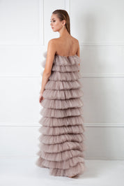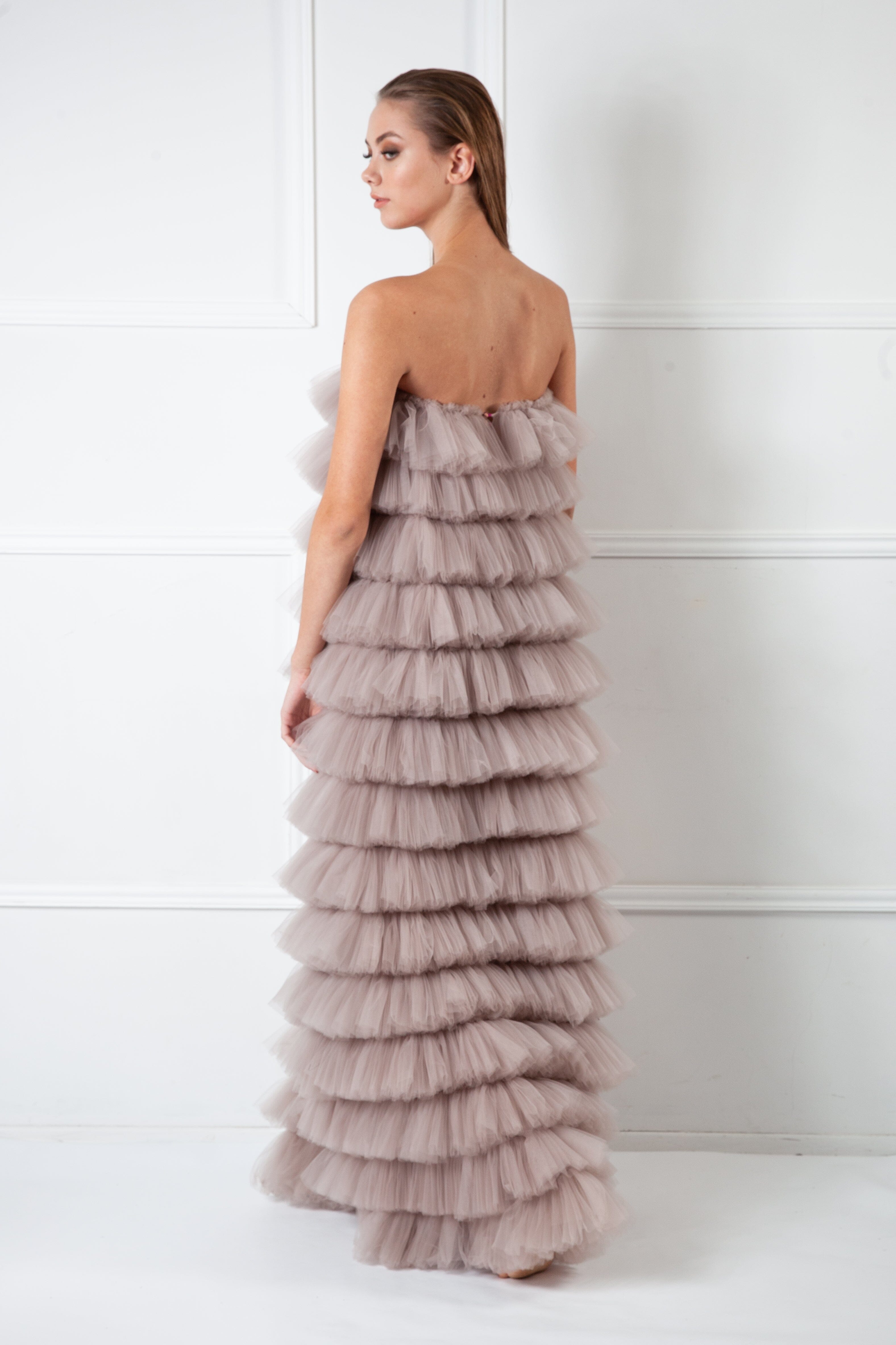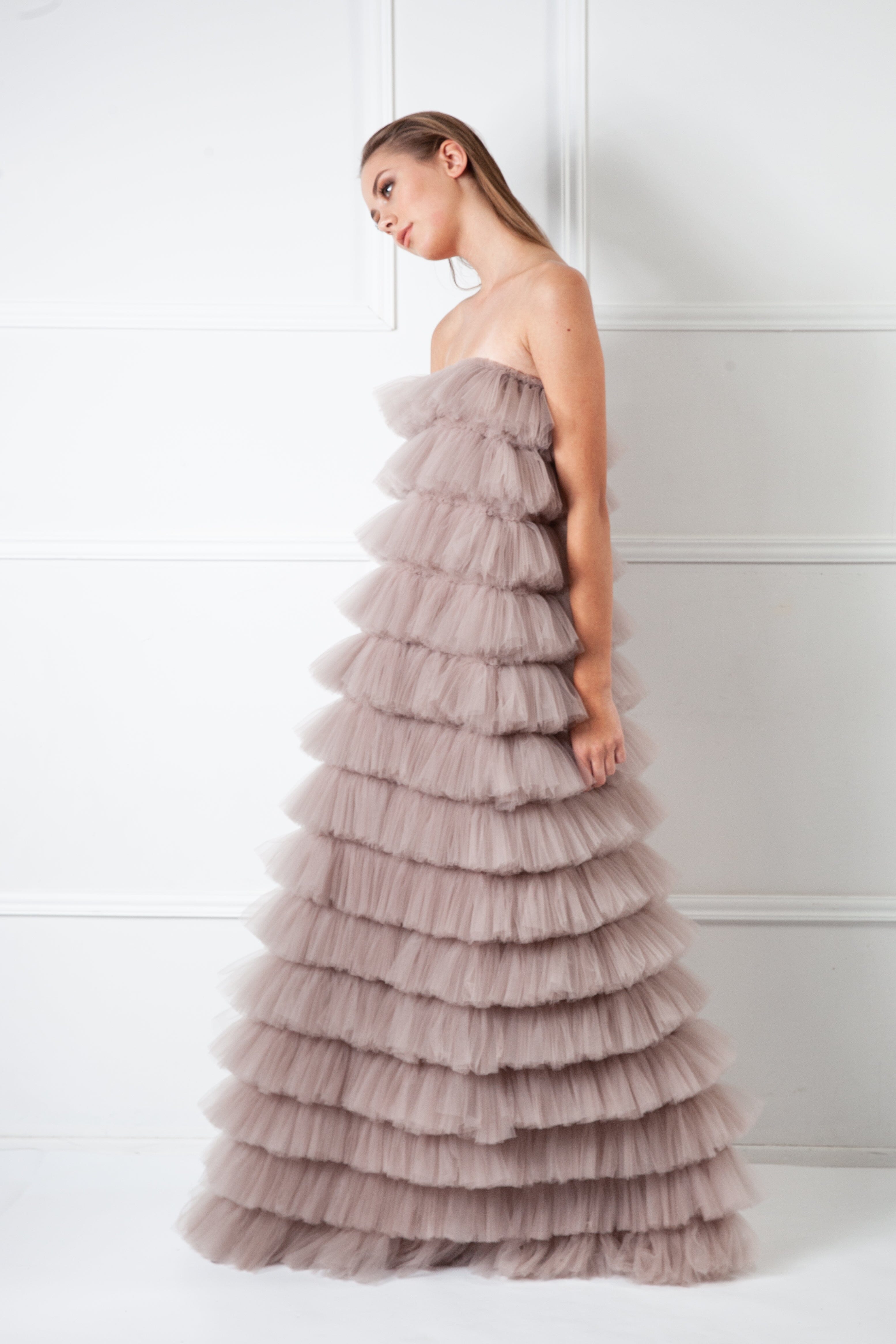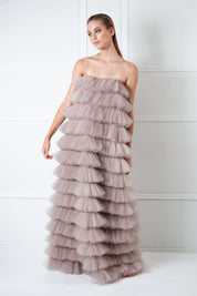 A showstopping piece that embodies the beauty of elegance and charm. This gown captures the essence of lightness and fluidity, with a delicate, ethereal flow that moves gracefully with every step. The Shining Hour Gown is designed to make a statement with its refined simplicity, allowing its delicate layers of tulle to create an unforgettable silhouette.