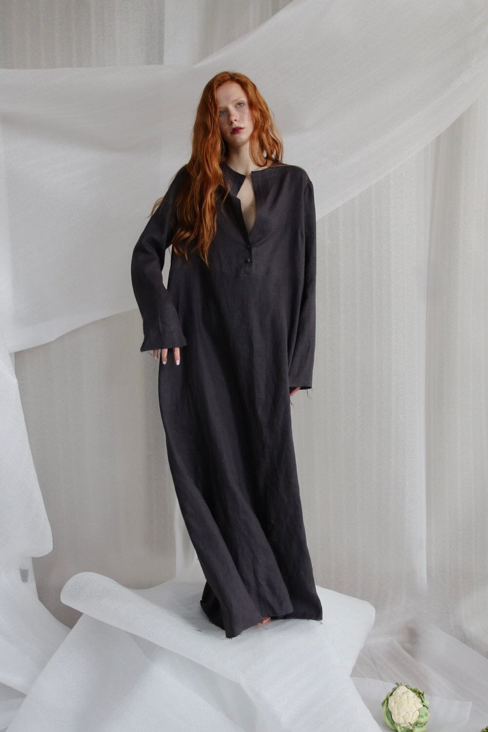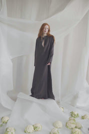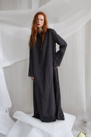Wrapped in the cool embrace of linen, this dress is a symphony of contrasts - a stately high collar graces the neck, while satin-covered buttons trail delicately down the front. The sleeves and hemline remain untouched, and a discreet side slit allows for fleeting moments of mystery. The deep, moody shade captures the confident essence of the dress — a statement piece for the quietly bold.
