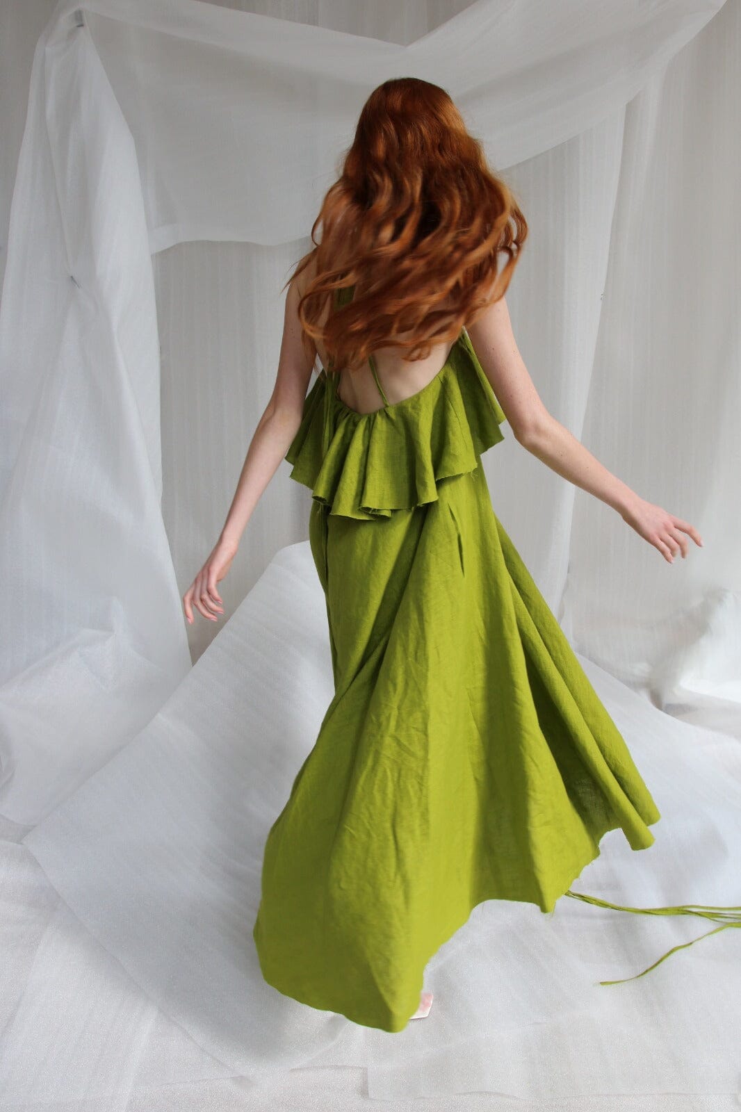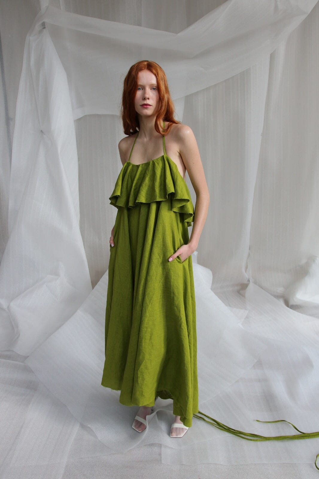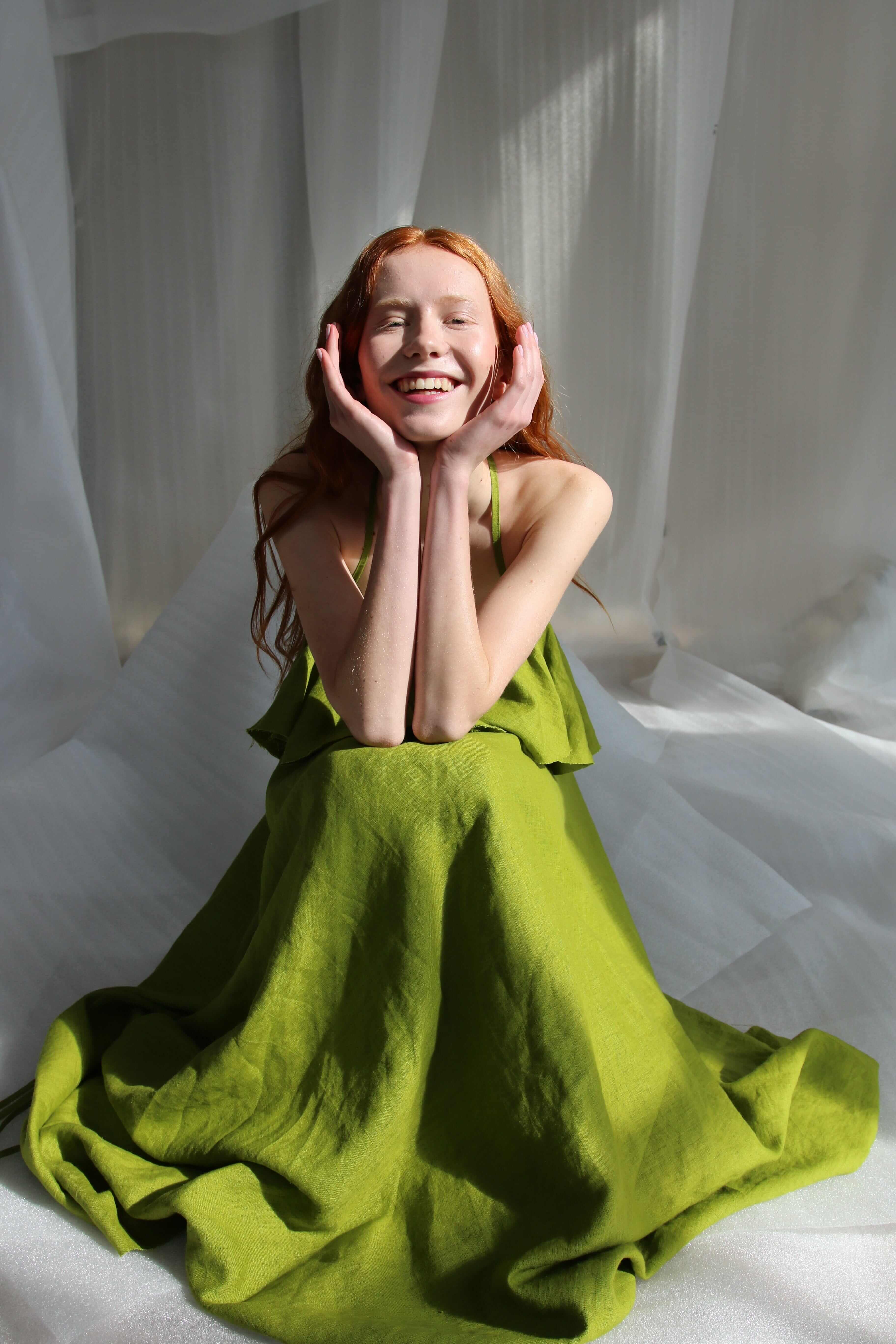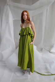 The deep green hue reminds of a lush summer garden, while the playful ruffles will captivate hearts wherever you go. Handy side pockets offer a touch of practicality without sacrificing style, while the elasticated back ensures a comfortable fit for all your summer escapades.