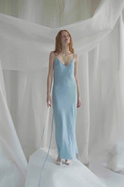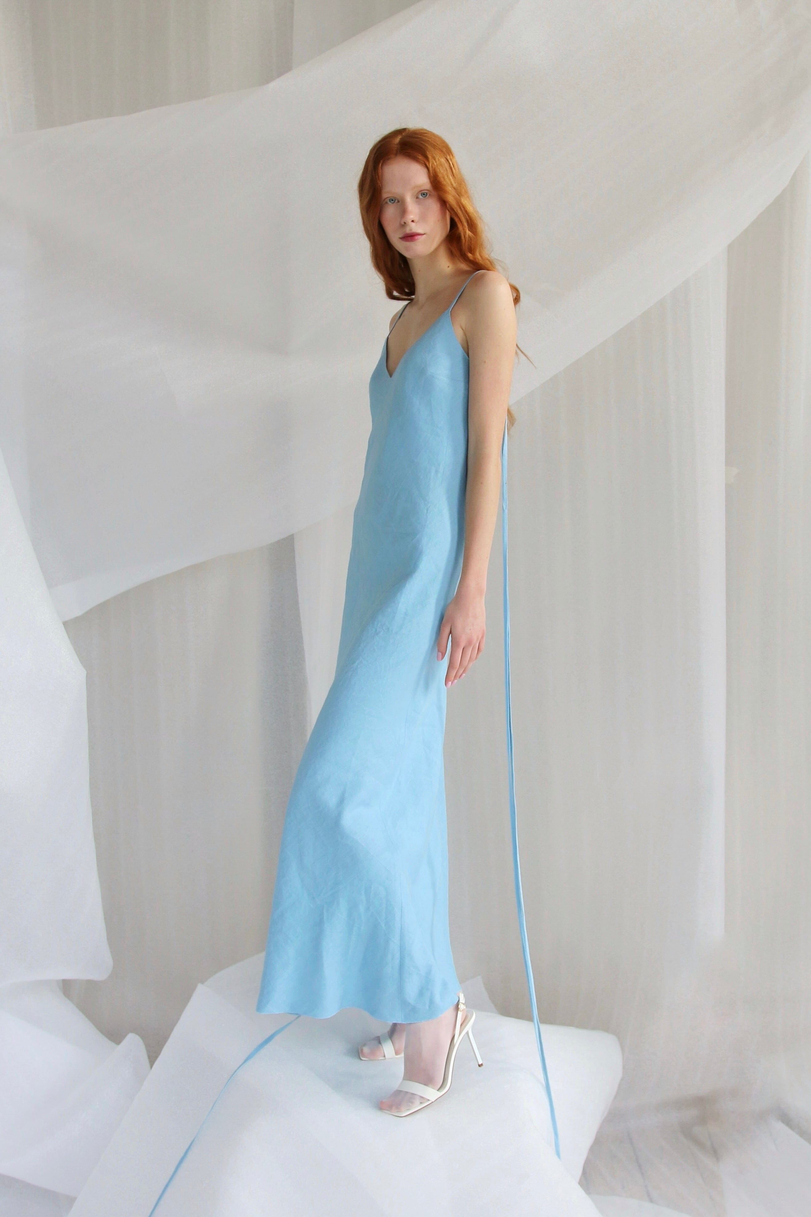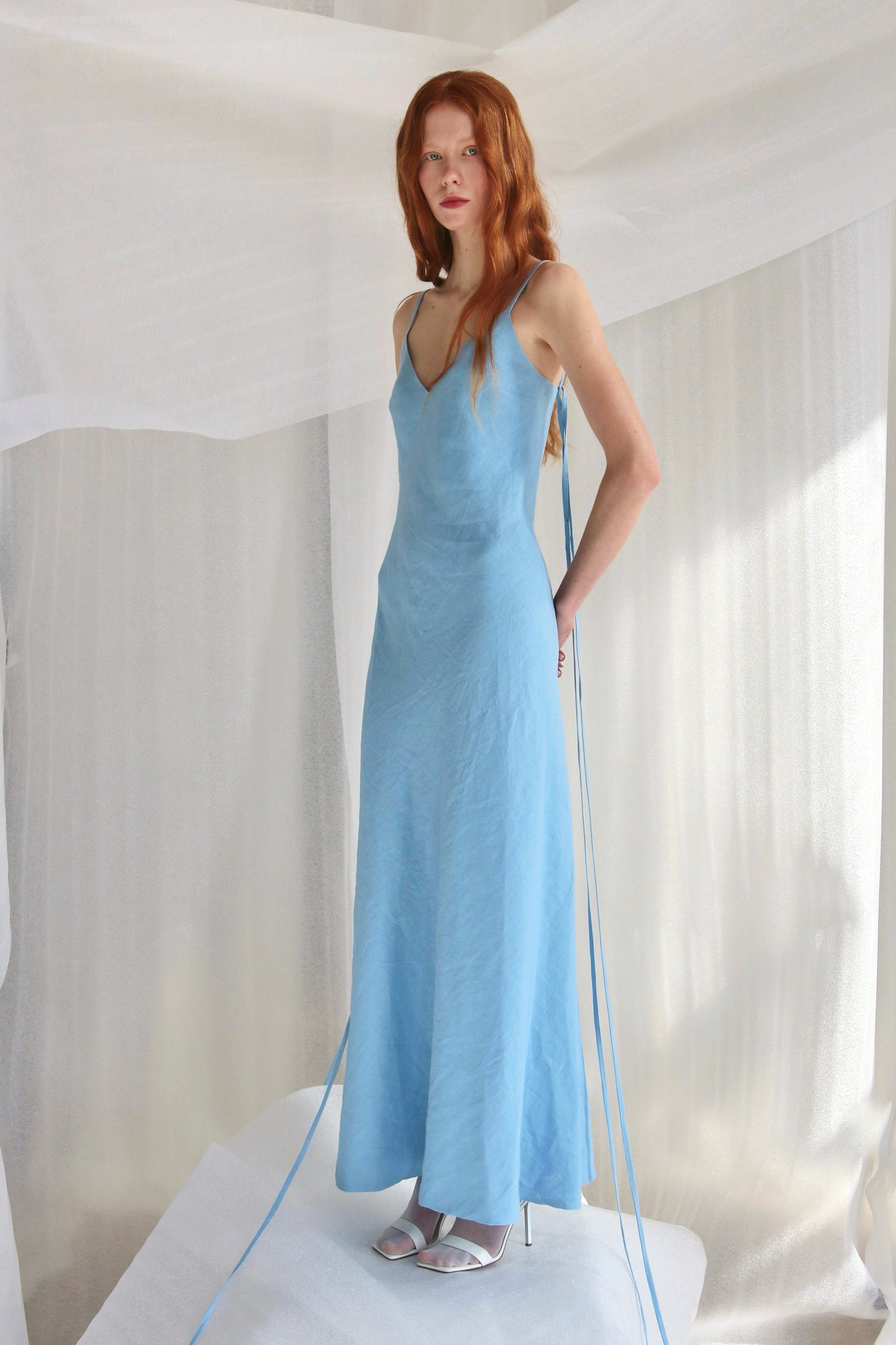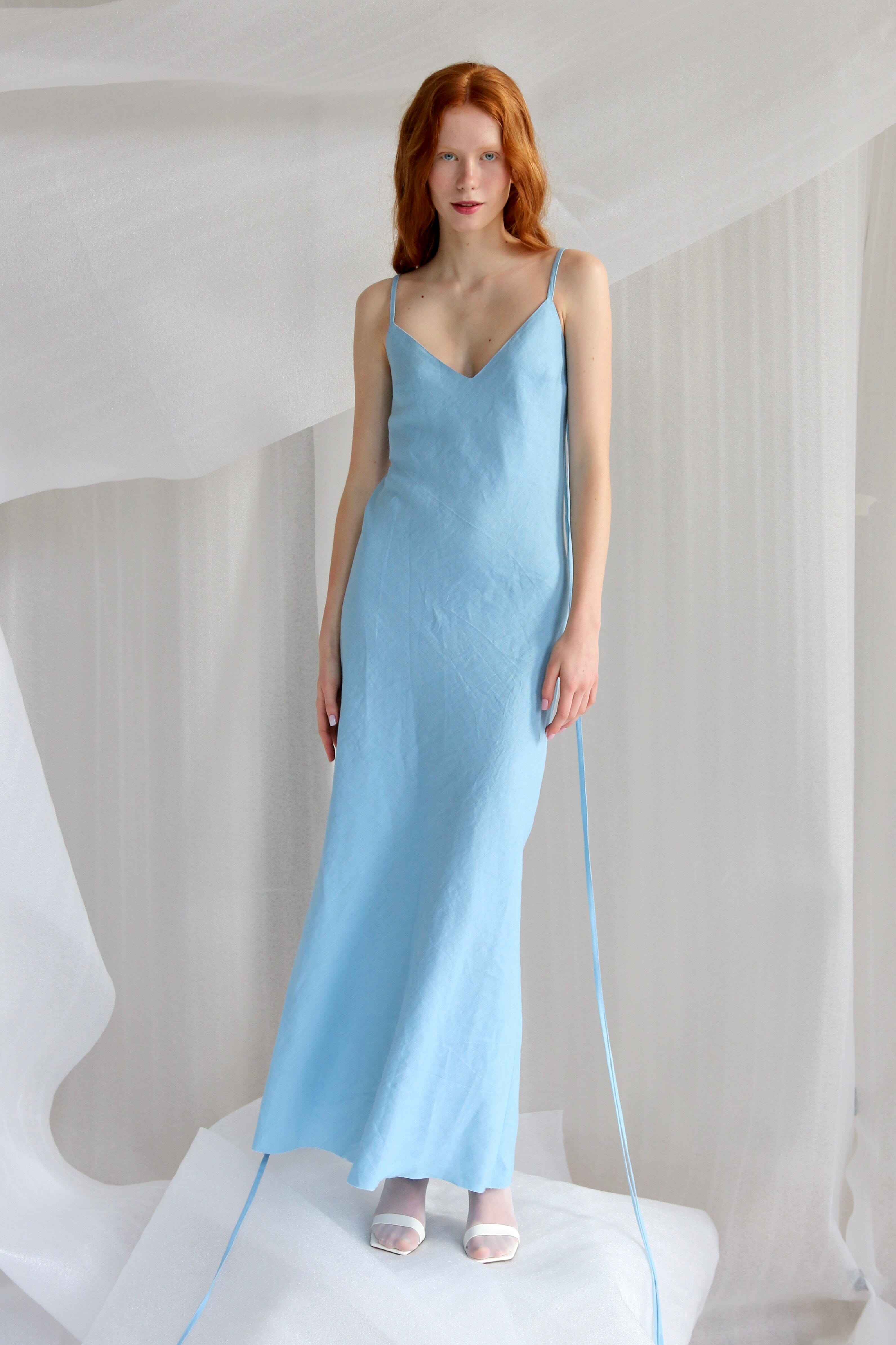Step into a breath of fresh air with this sky-blue garment reminiscent of tranquil horizons. The bodice is neatly framed with a polished finish, while the unadorned hemline whispers natural simplicity. Slim, tieable linen ribbons grace the shoulders, completing a silhouette of easy-going elegance and comfort.