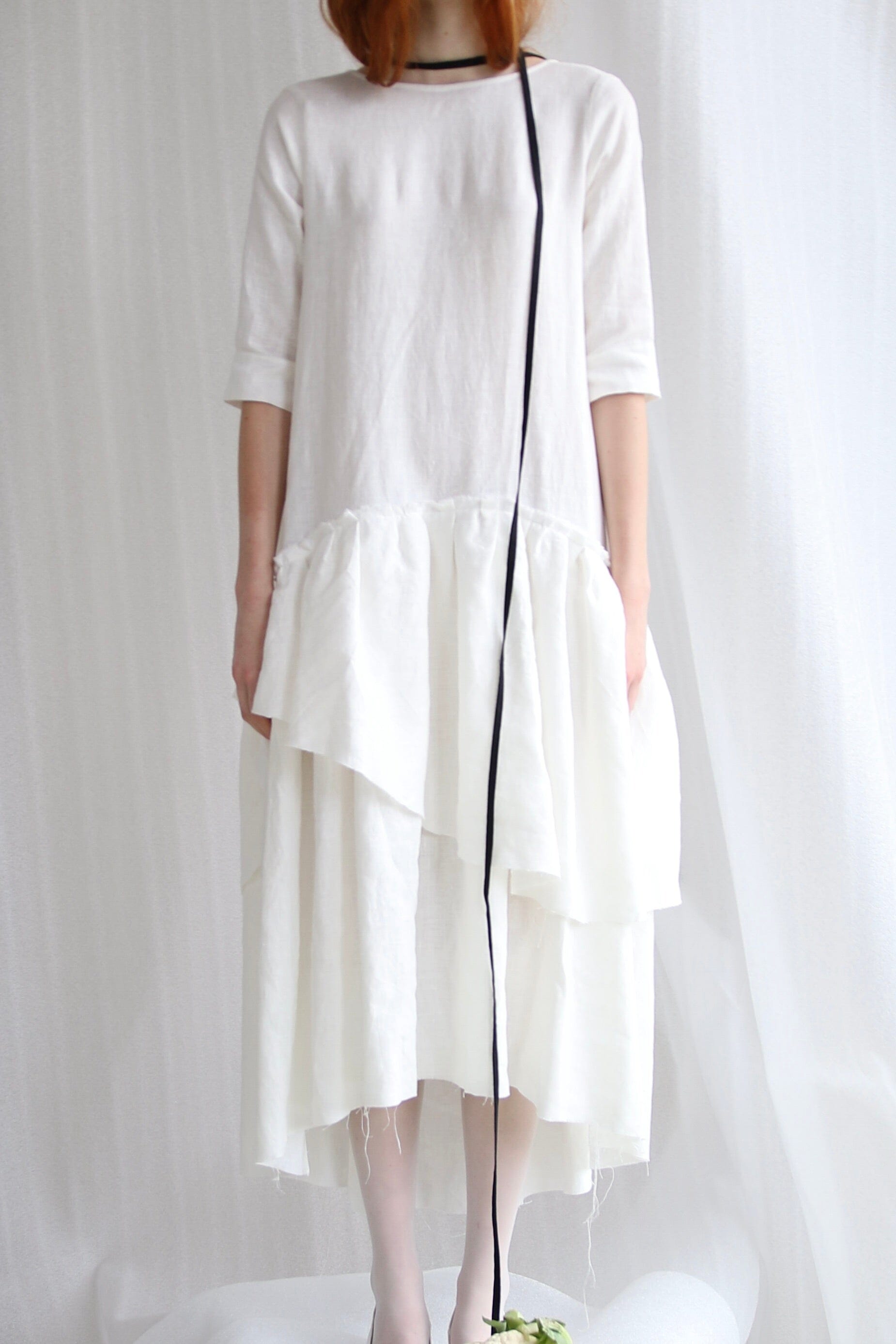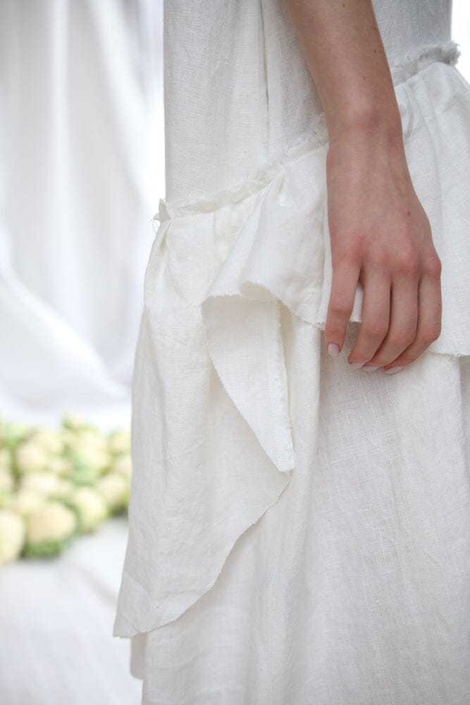 Embrace a poetic elegance with this white linen piece, designed with a cut-out back and secured by a contrasting black linen ribbon. The upper part of the dress provides a clean and elegant structure, while the sleeves are thoughtfully tailored with a small slit for ease of movement. With pockets for a touch of whimsy and playful ruffle, it celebrates the unspoken grace and everyday enchantment.