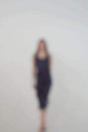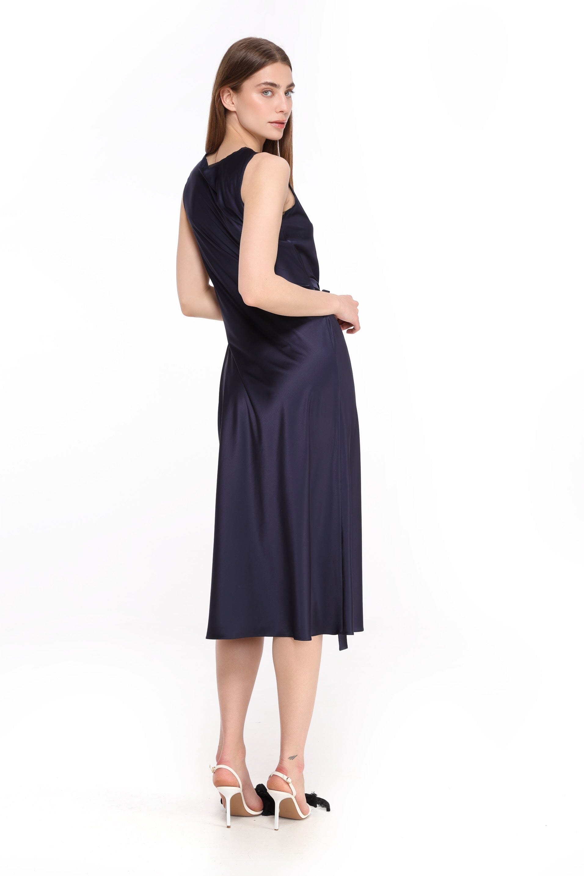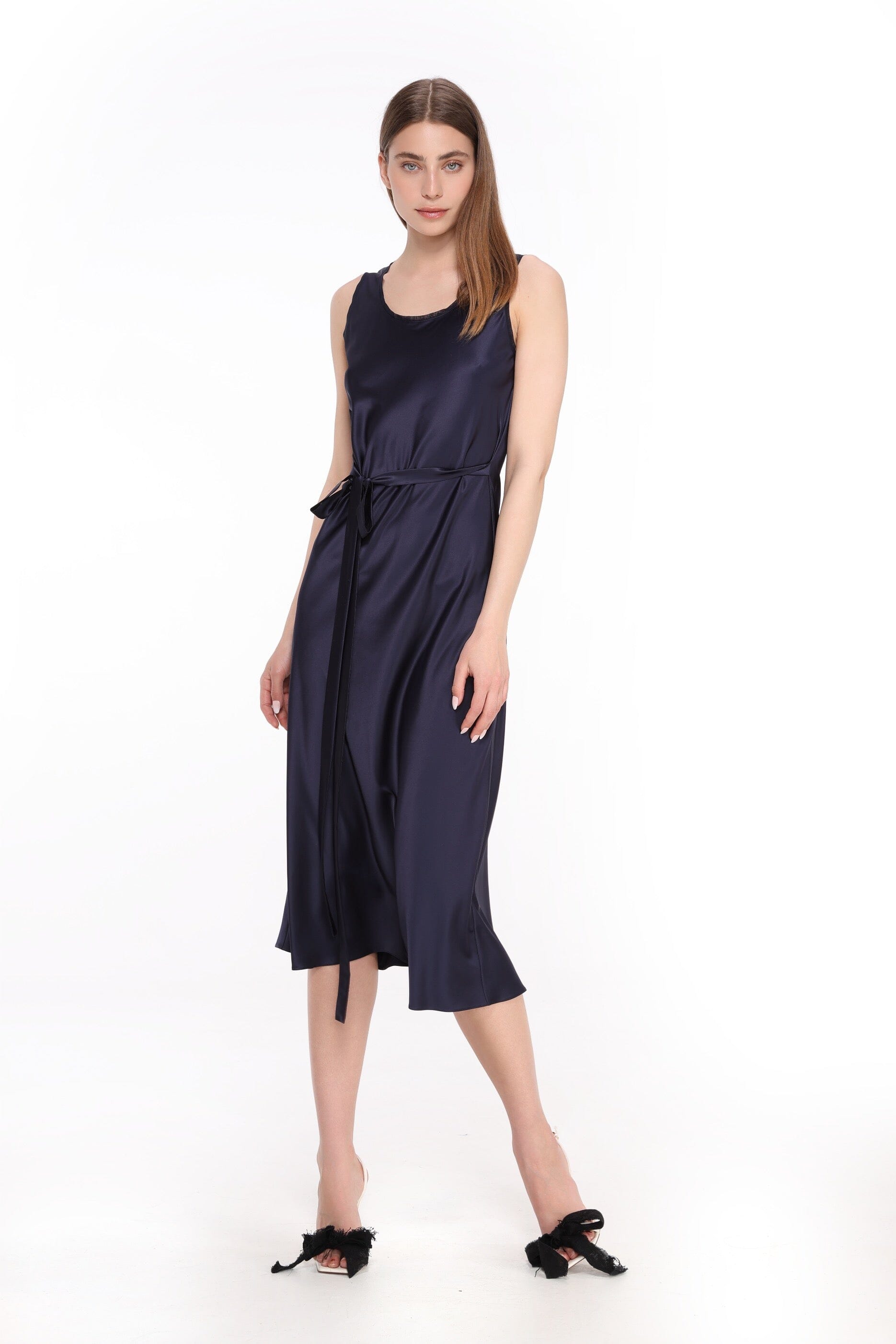 Sleeveless and effortlessly elegant, the neckline and armholes are softly trimmed with fine mesh fabric, adding a whisper of sheer detail. The dress falls to a graceful midi length, while a slim satin waistband gently highlights the waistline, creating a refined and feminine silhouette.