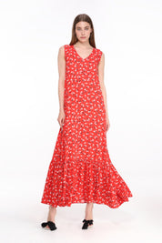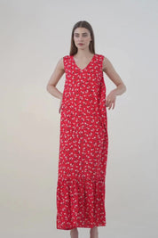 "Floral Sea Dress" - vibrant and tender, this sleeveless maxi dress flows like a wave adorned with flowers. Made from soft, breathable viscose with a painterly floral print, it evokes a sense of oceanic calm and natural beauty. The V-shaped neckline adds elegance, while the relaxed silhouette ensures graceful movement. A matching fabric ruffle at the hem brings volume and a breezy, romantic finish. Perfect for warm-weather strolls, beachside holidays, or open-air evenings under the stars.