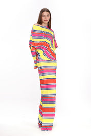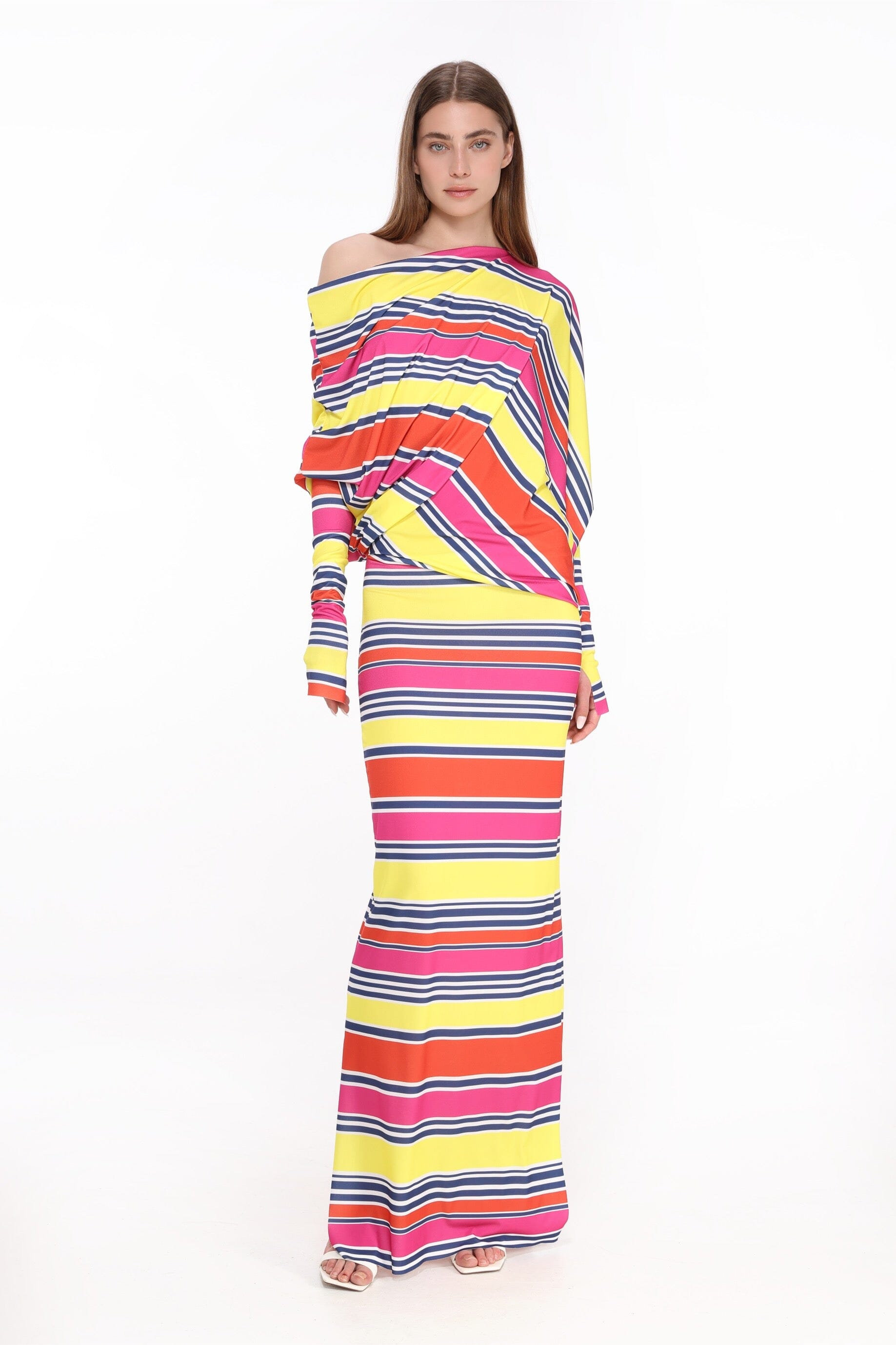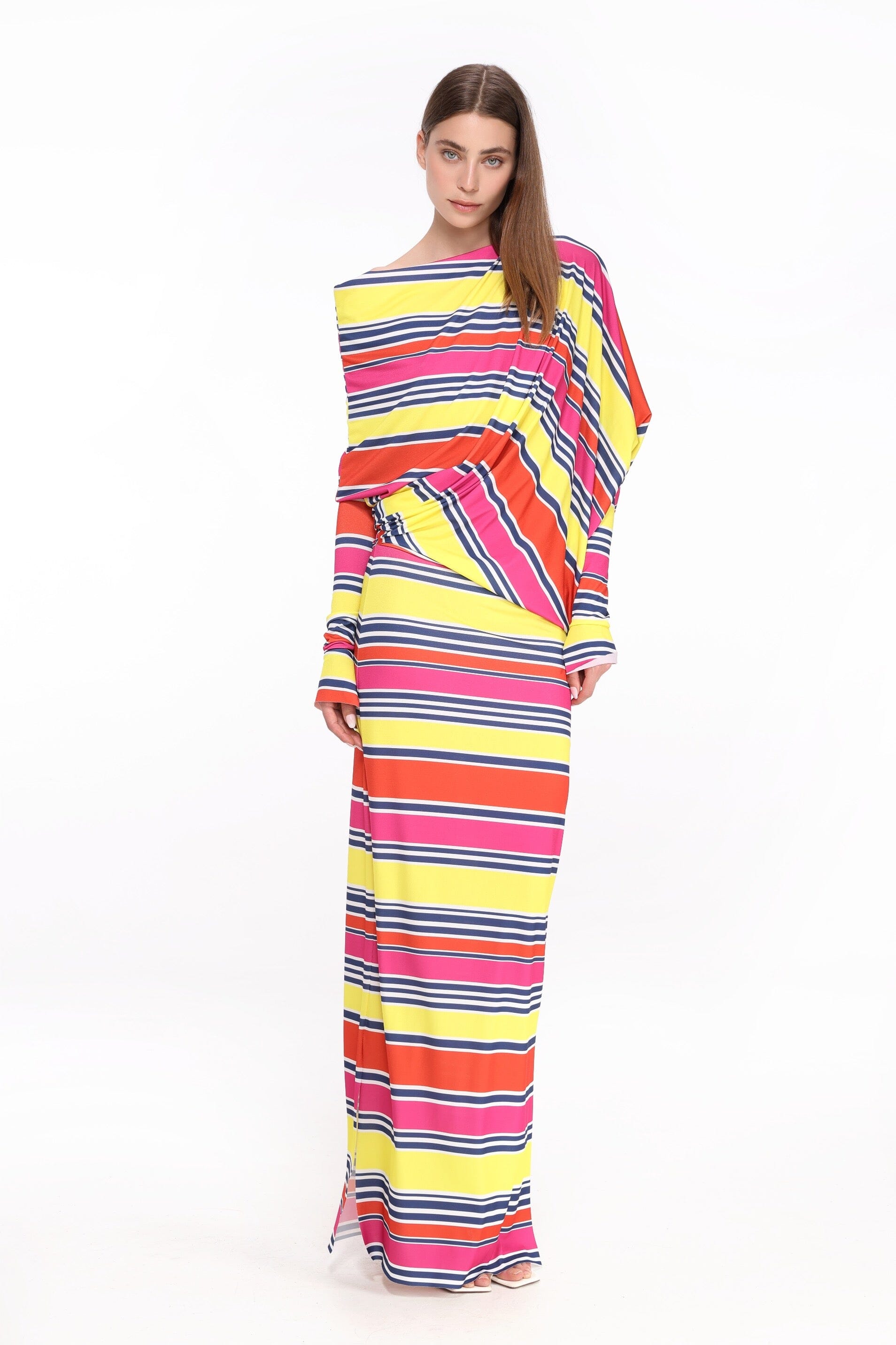 This dramatic maxi dress reimagines elegance through the lens of asymmetry and bold design choices. Crafted with a focus composition and contrast, the dress features asymmetrical silhouette, where seams, textures, and details are deliberately offset to create visual intrigue. The design is further elevated by a mix of rich textures andtonal depth, highlighting the play between structure and softness. One of the standout elements is the batwing sleeve, which introduces volume and fluidity on one side, while the other remains sleek and minimal - a perfect embodiment of balance through imbalance. Unique in its color, yet avant-garde in its construction, this piece offers a refined, modern take on the multi color dress.