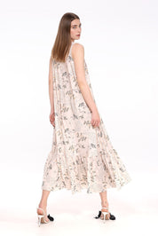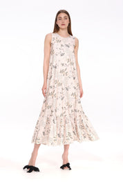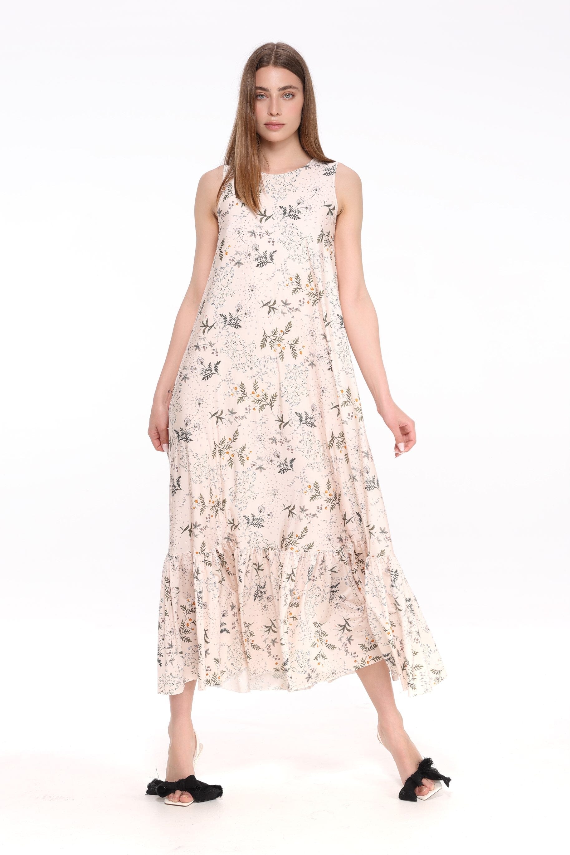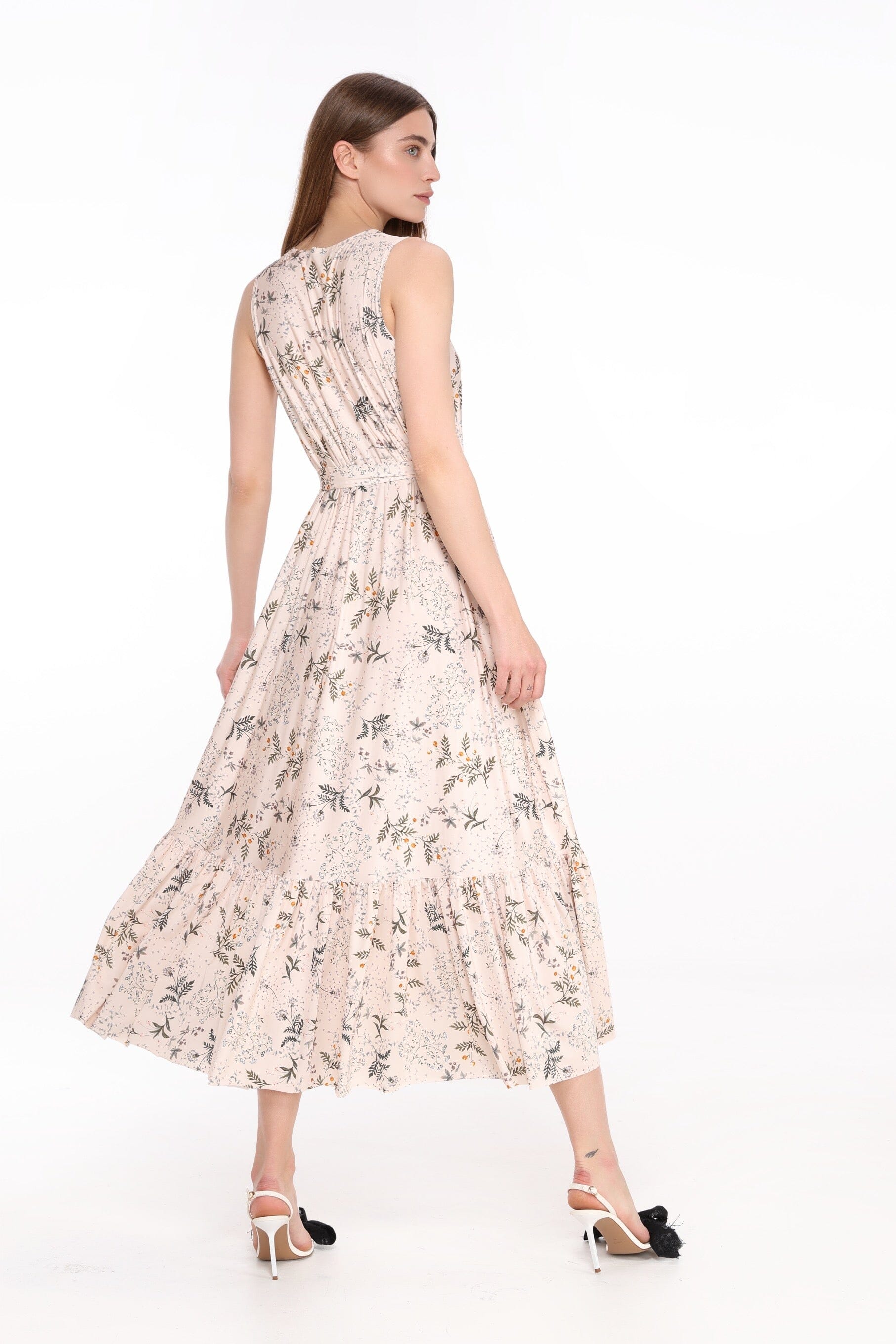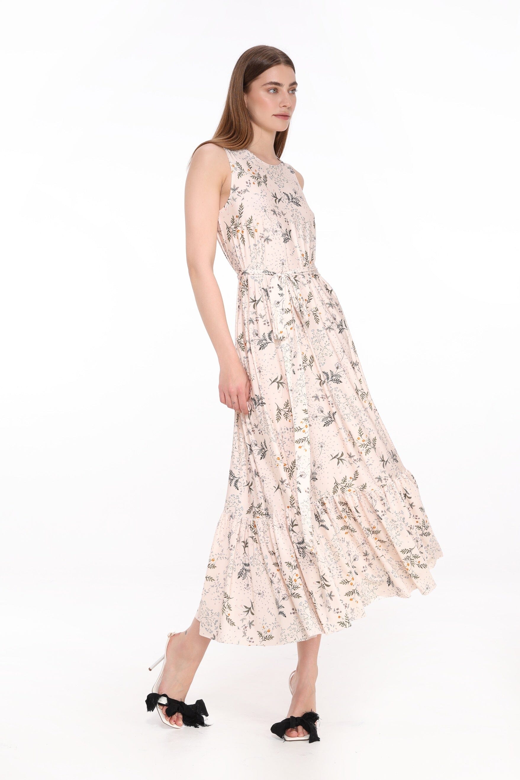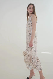 "Summer Dandelion Dress" - a soft, airy midi dress, as if woven from summer breeze and wildflower petals. The sleeveless design and round neckline create a clean, lightweight silhouette. A matching fabric belt at the waist allows for adjustable styling and a flattering fit. The hem is finished with a ruffle made from the same fabric, adding gentle movement and a floaty feel.