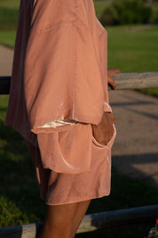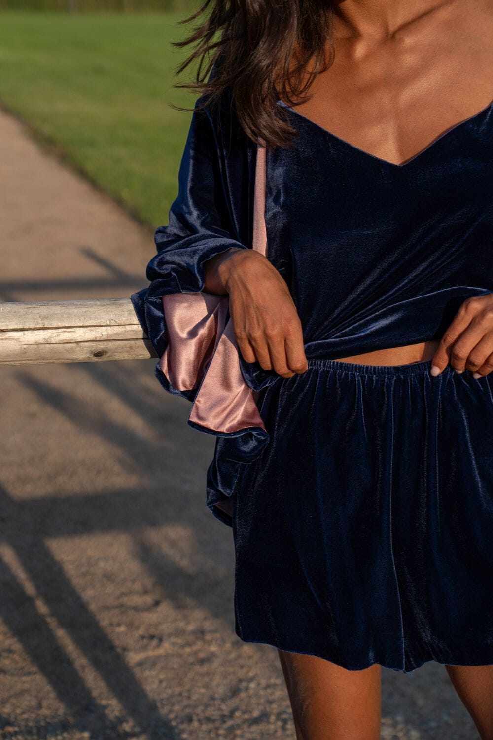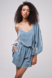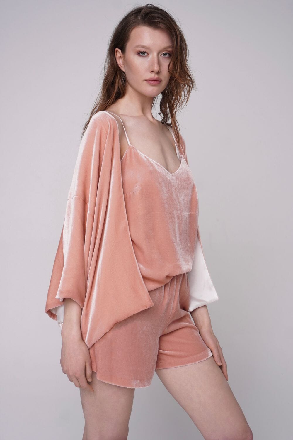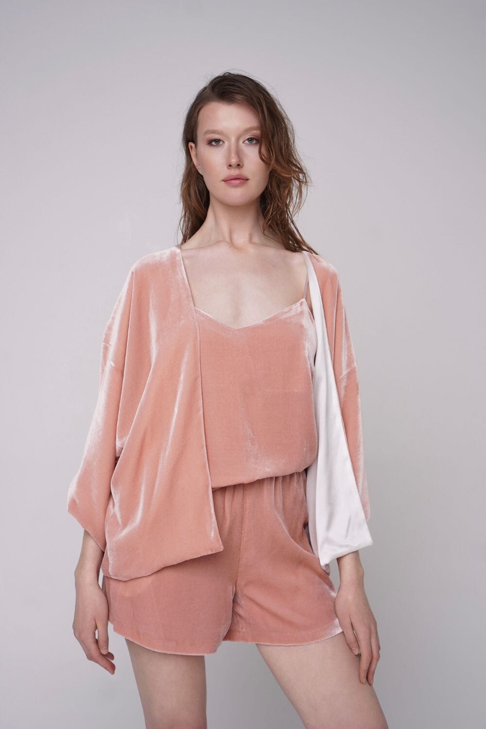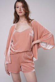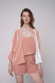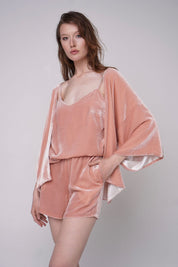 Elegant and airy silk-velvet three piece set of cardigan, top and shorts. It's perfect for lounging at home or taking to a romantic getaway for those cozy evenings in. Wear it as a set or pair each piece separately with matching elements.