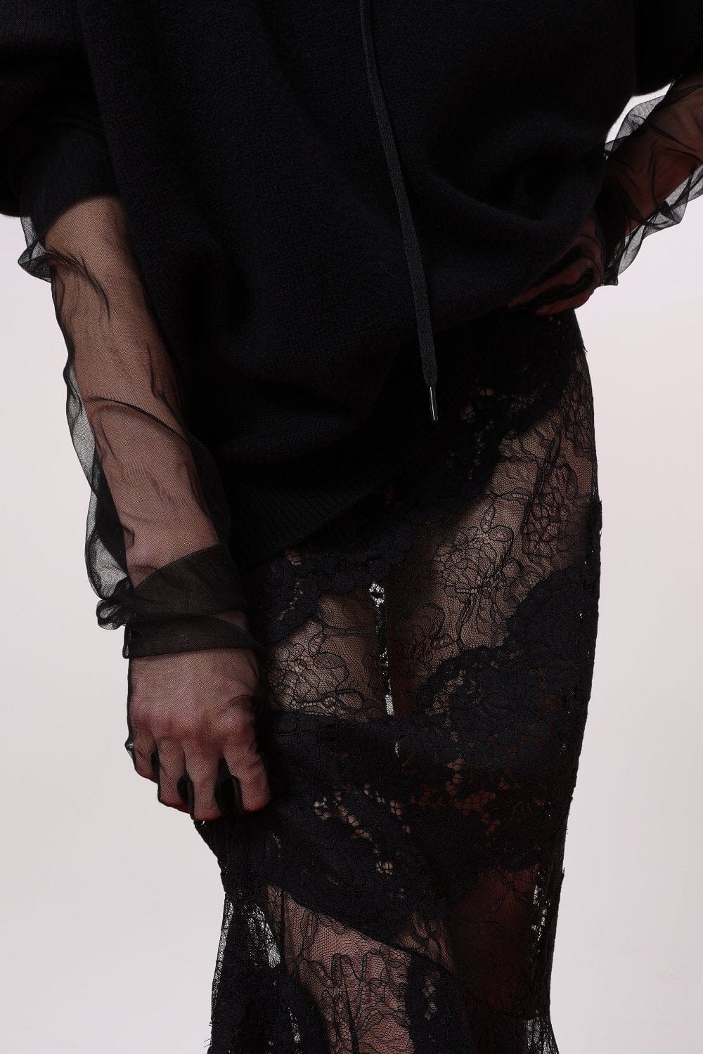 The delicately crafted lace skirt offers a harmonious blend of timeless femininity and modern ease. The intricate lace design creates a refined, textured look, while the frill adds a playful yet elegant touch. An elastic waistband ensures a comfortable and secure fit, maintaining the skirt’s sleek silhouette without compromising on ease. Subtle and sophisticated, this skirt is a testament to minimalistic charm, perfect for those who appreciate pieces that whisper elegance and make a lasting impression through their graceful simplicity.