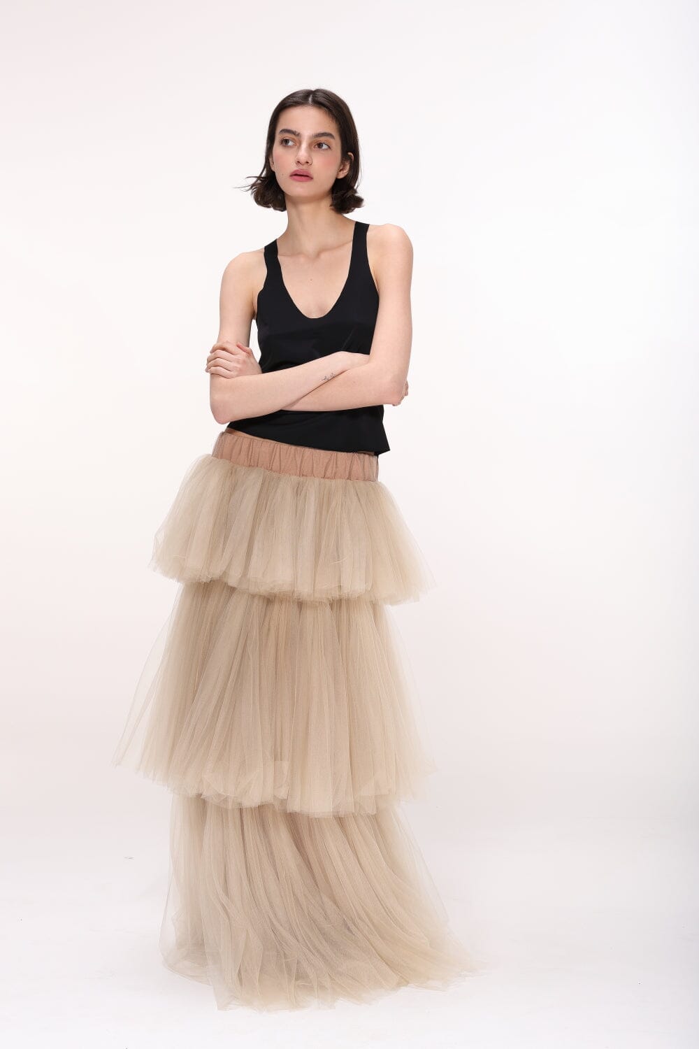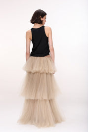 This breathtaking full-length skirt is made from soft mesh fabric, offering both comfort and a beautifully flowing shape. The skirt features an elastic waistband, ensuring a perfect fit and freedom of movement, making it suitable for both everyday wear and special occasions. The intricate ruffles are meticulously handcrafted: each layer is gathered by hand and then sewn onto the skirt. The luxurious design includes three layers of ruffles, creating a voluminous pleated effect that adds beautiful texture and depth to the overall look. The length of the skirt emphasizes its elegant, feminine silhouette, making it the perfect addition to any wardrobe for creating a chic and sophisticated appearance.