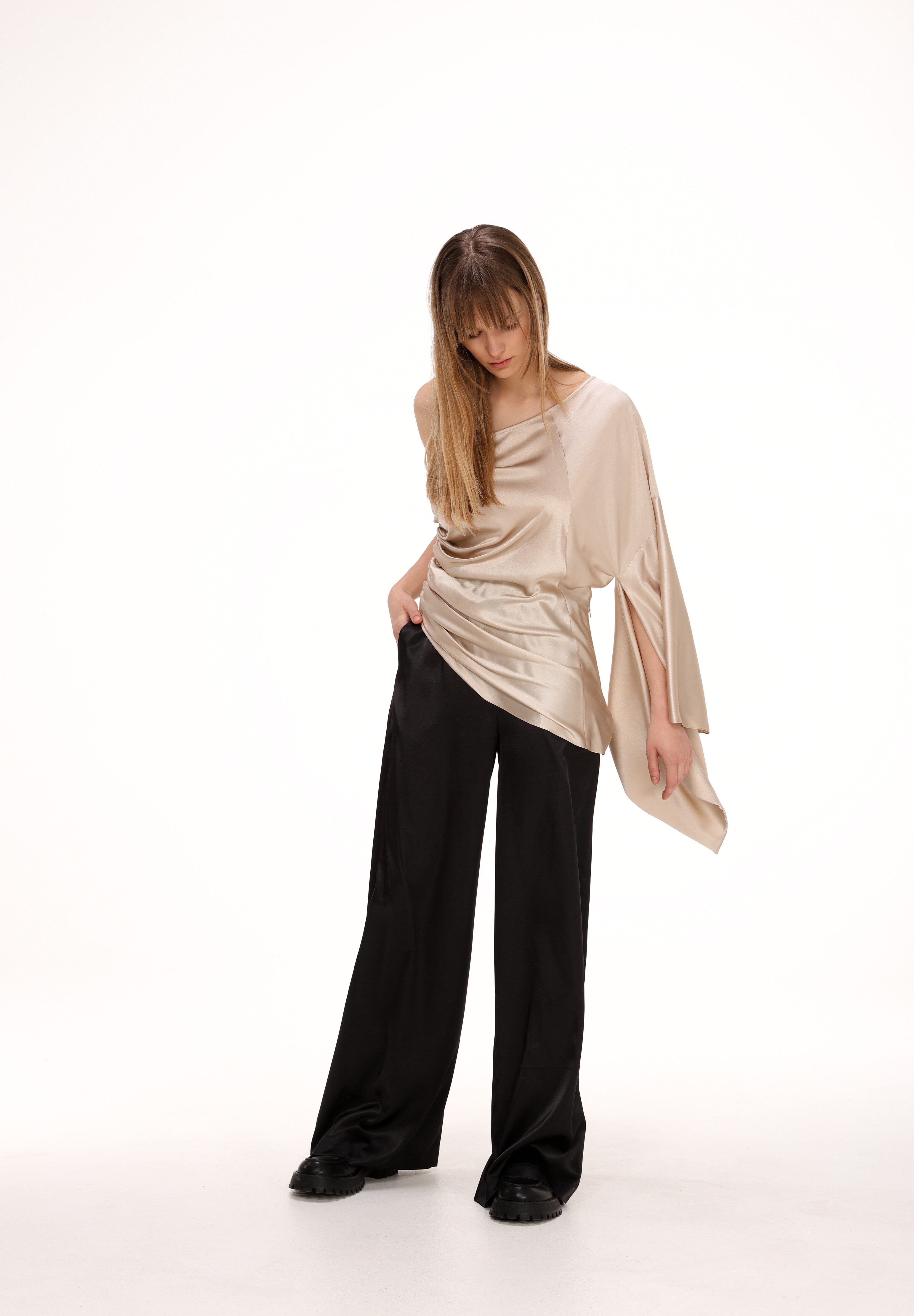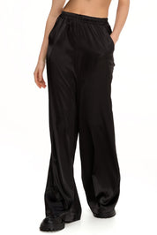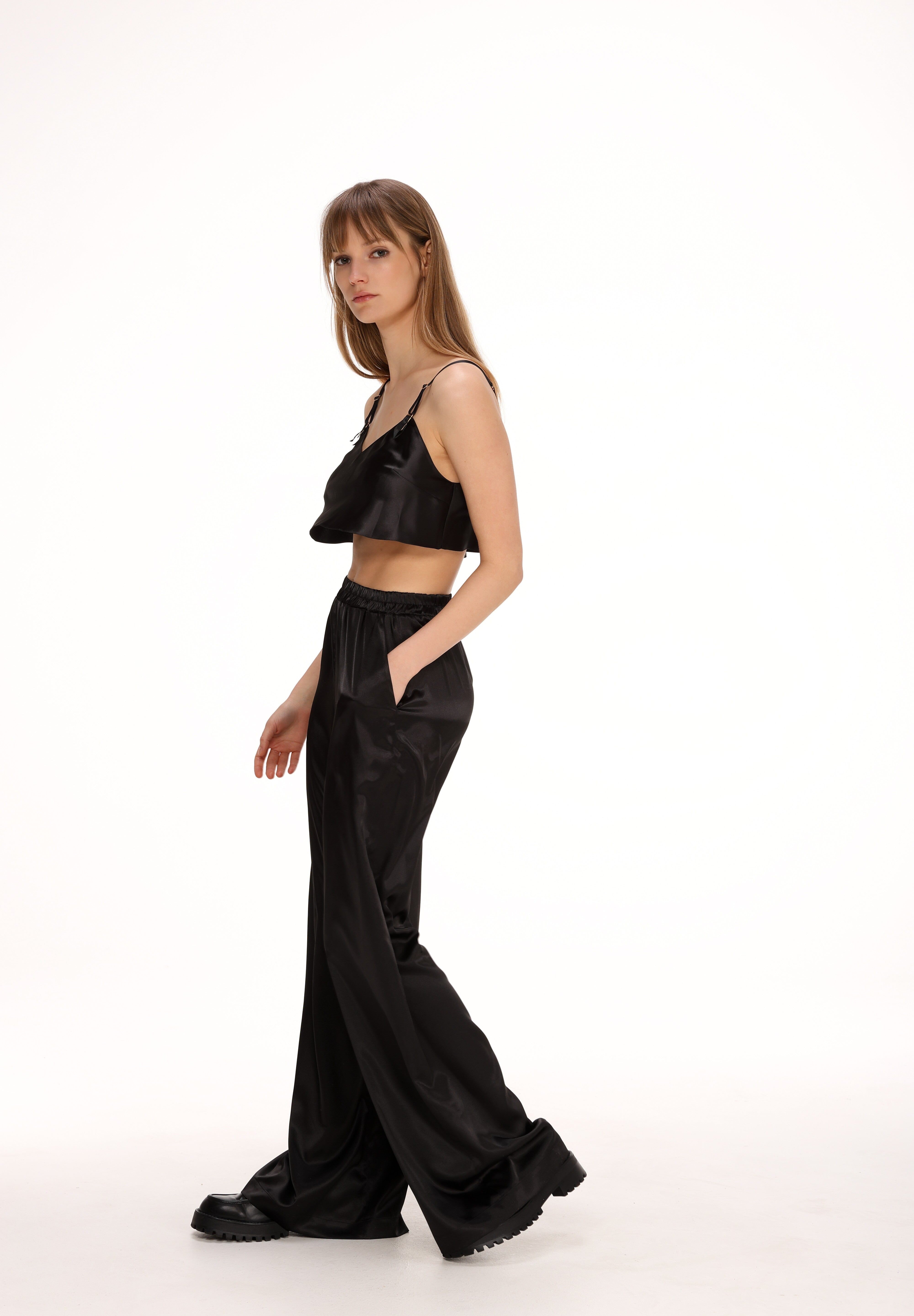 The satin trousers embody a perfect blend of comfort and sophistication, offering a refined take on effortless elegance. Crafted from smooth, lustrous fabric, they drape beautifully, enhancing the silhouette with fluid grace. The elastic waistband ensures a flawless fit while providing ease of movement, making them as practical as they are stylish. Thoughtfully designed pockets add both functionality and a relaxed charm, seamlessly integrating into the sleek design. With their minimalistic yet impactful presence, these trousers are an ideal choice for those who appreciate understated luxury that transitions effortlessly from day to night.