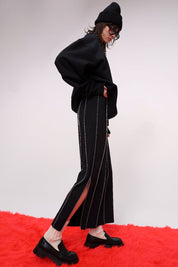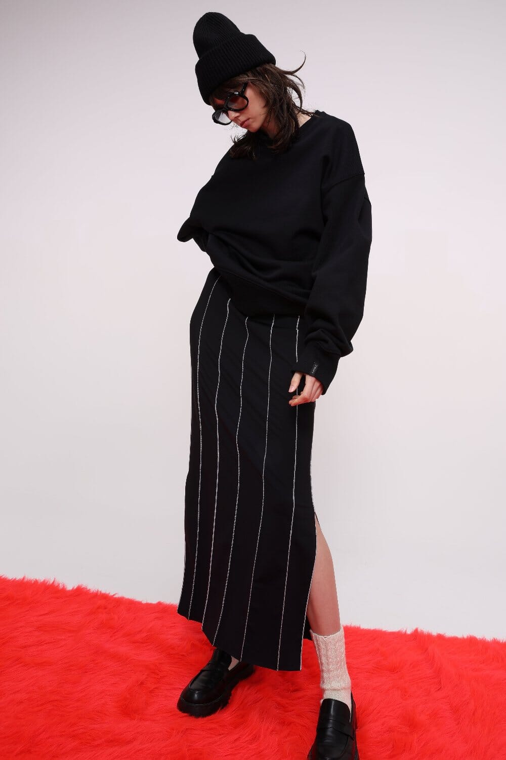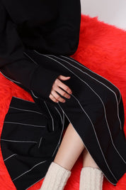 The meticulously crafted straight-cut skirt strikes the perfect balance between sophisticated elegance and modern allure. A subtle side slit adds an element of intrigue, allowing for ease of movement while maintaining the skirt’s graceful flow. The clean, streamlined design highlights the skirt’s effortless charm, while its tailored fit ensures a flattering silhouette. A timeless piece that seamlessly blends classic style with contemporary detail, this skirt is a testament to minimalistic elegance, perfect for those who appreciate subtle yet impactful design.