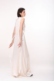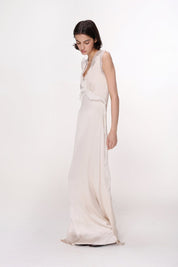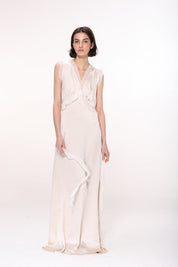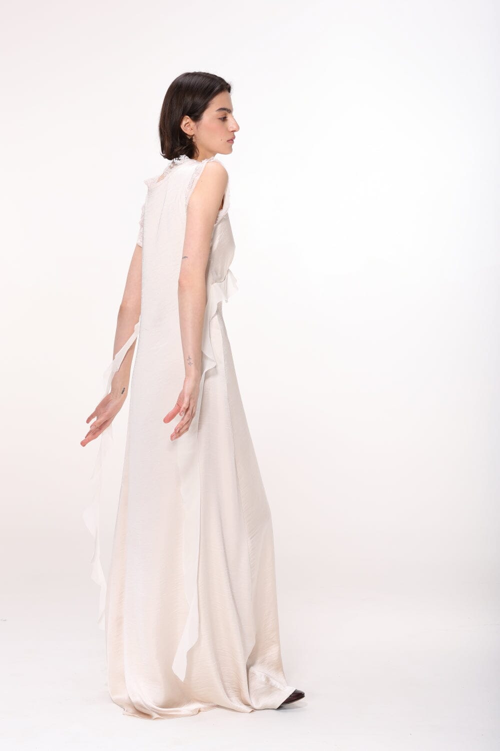 This beautiful maxi dress is crafted with timeless elegance and delicate details. Featuring intricate lace trim across the front, it gracefully frames the bust and waist, accentuating your figure and creating a feminine silhouette. The sleeveless design enhances the dress's light, airy feel, while the lace adorning the armholes adds a subtle, romantic touch. The V-neckline draws attention to the bust, adding a hint of allure. The flowing maxi length offers sophistication, making it the perfect choice for intimate evenings or elegant occasions where you want to leave a lasting impression.