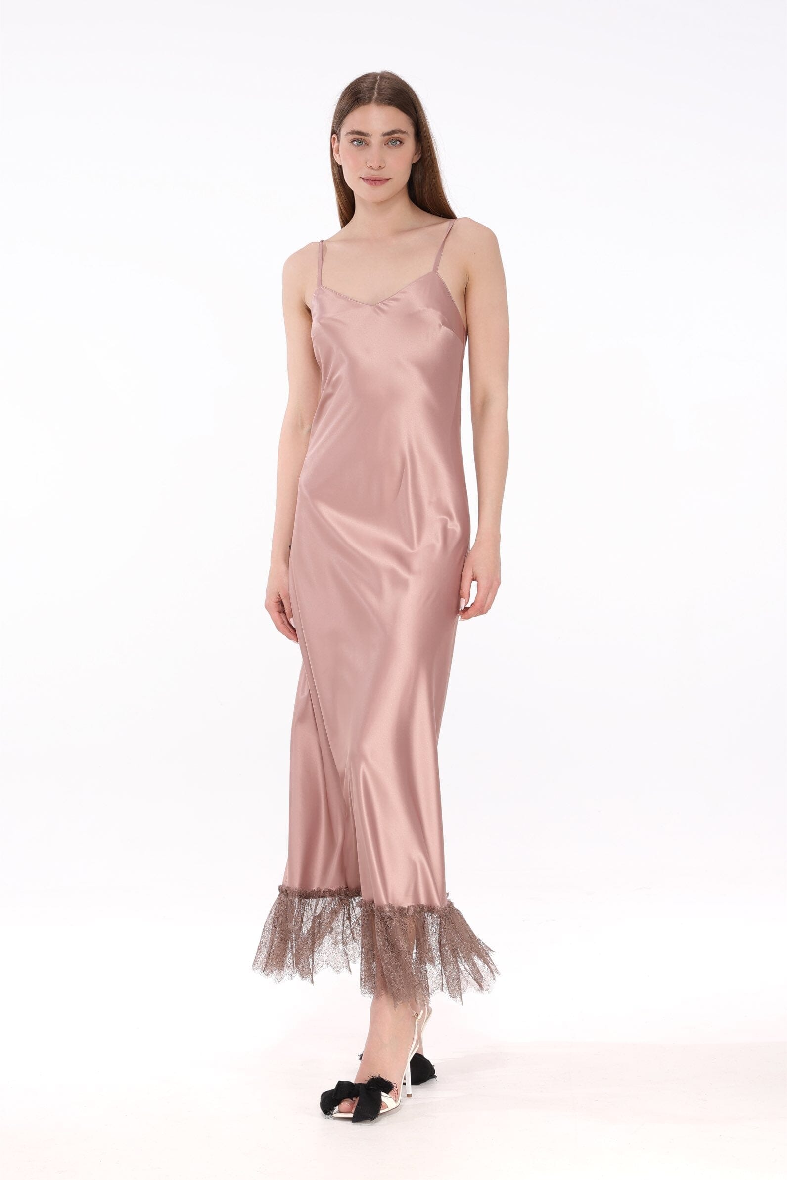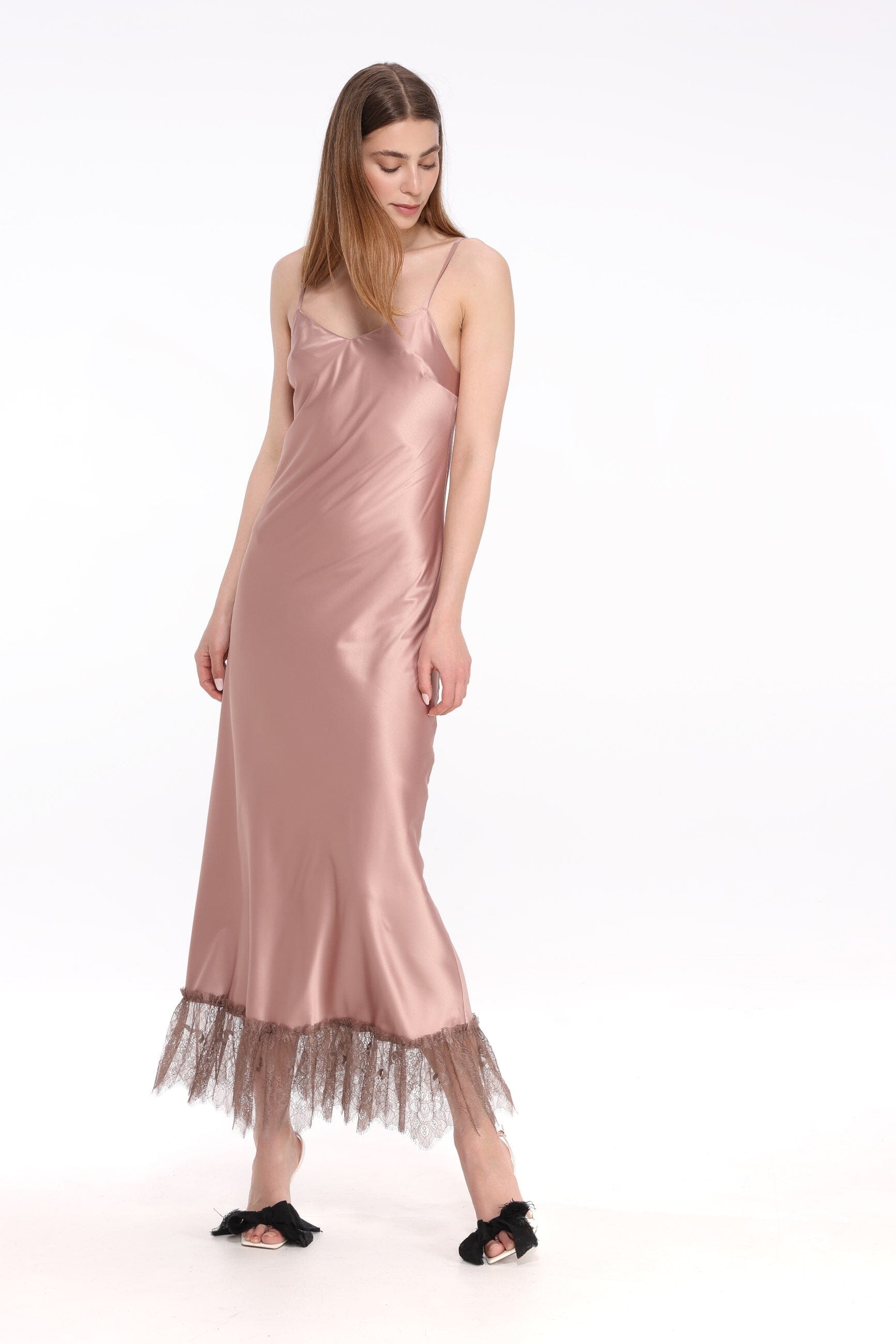 Lovely Slip Dress - an elegant powder slip dress crafted from fluid satin fabric. Designed with adjustable straps for a perfect fit, it features a delicate lace trim along the hem, adding a touch of sophistication and romantic allure. A timeless choice for evening outings, intimate dinners, or special occasions.