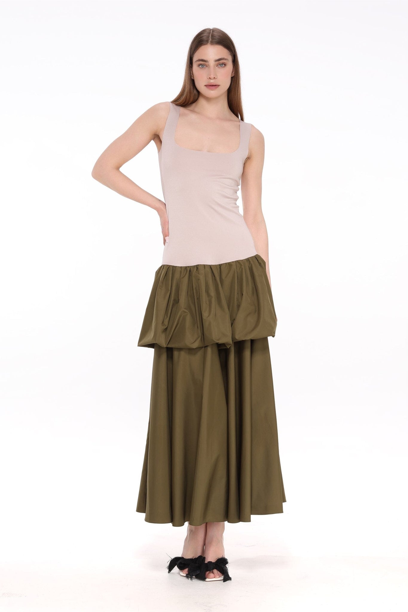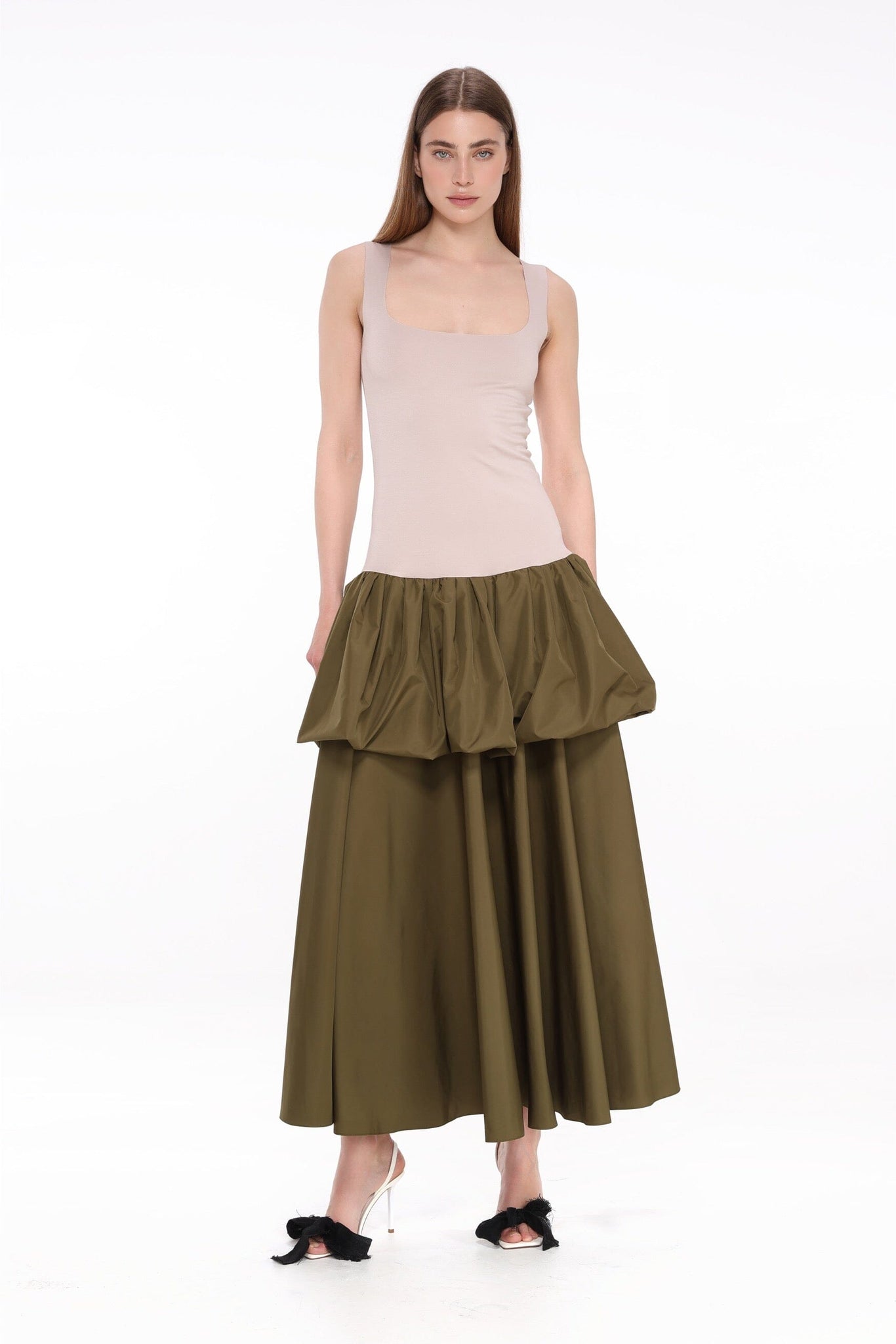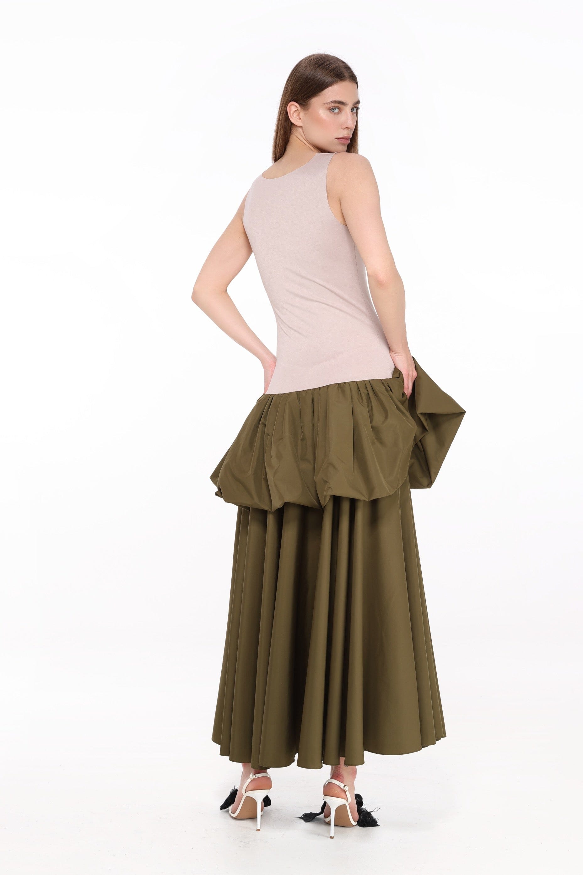 Kleita veidota divtoņu krāsu gammā, kas izceļ tās arhitektoniskās līnijas un piešķir vizuālu dziļumu. Piedurkņu neesamība ļauj pilnībā izcelt kakla līniju un plecus.