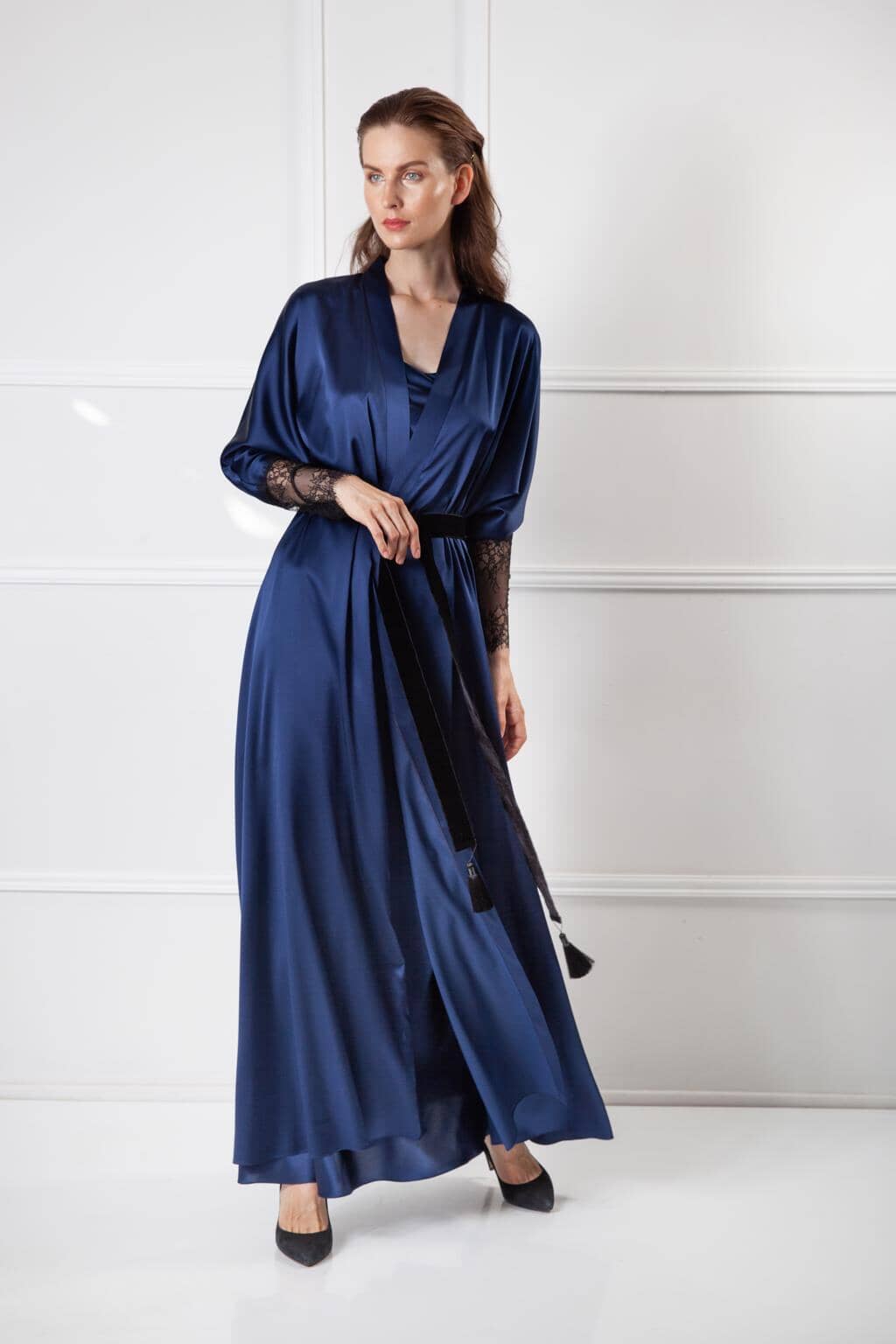 Luxury silk robe with French lace trimming and velvet belt. Hand-made details, premium design and quality that inspire you to love, seduce and feel feminine every day. Made with love in Latvia to treasure your femininity, designed to be beautiful at home and beyond. Amoralle creates handcrafted gowns from 100% pure Italian silk and exclusive French lace.