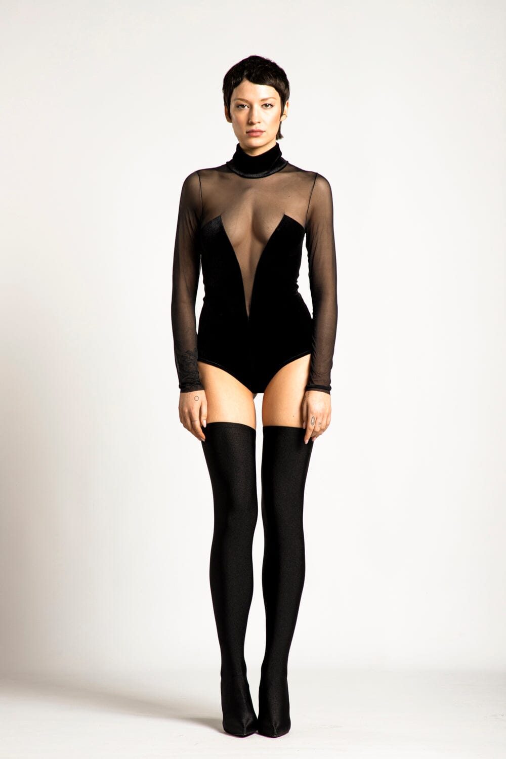 Juteklisks bodijs ar tīklveida un samta detaļām no Amoralle modes skates Gentle Forest Rain. Bodijam ir augsta apkakle un sievišķīgs piegriezums.