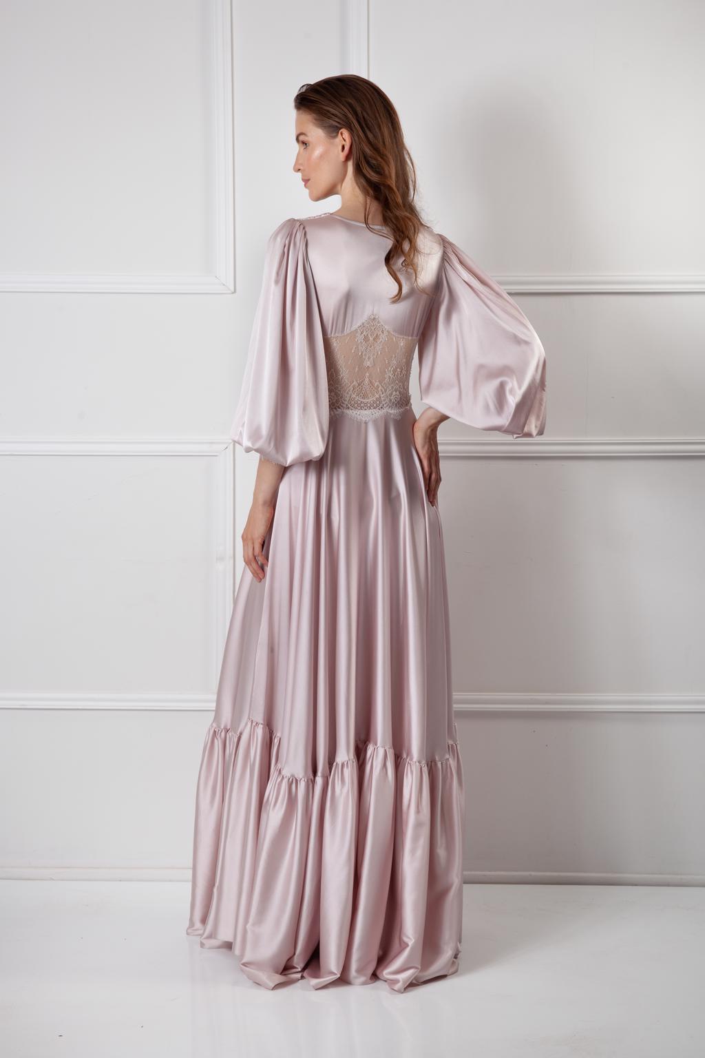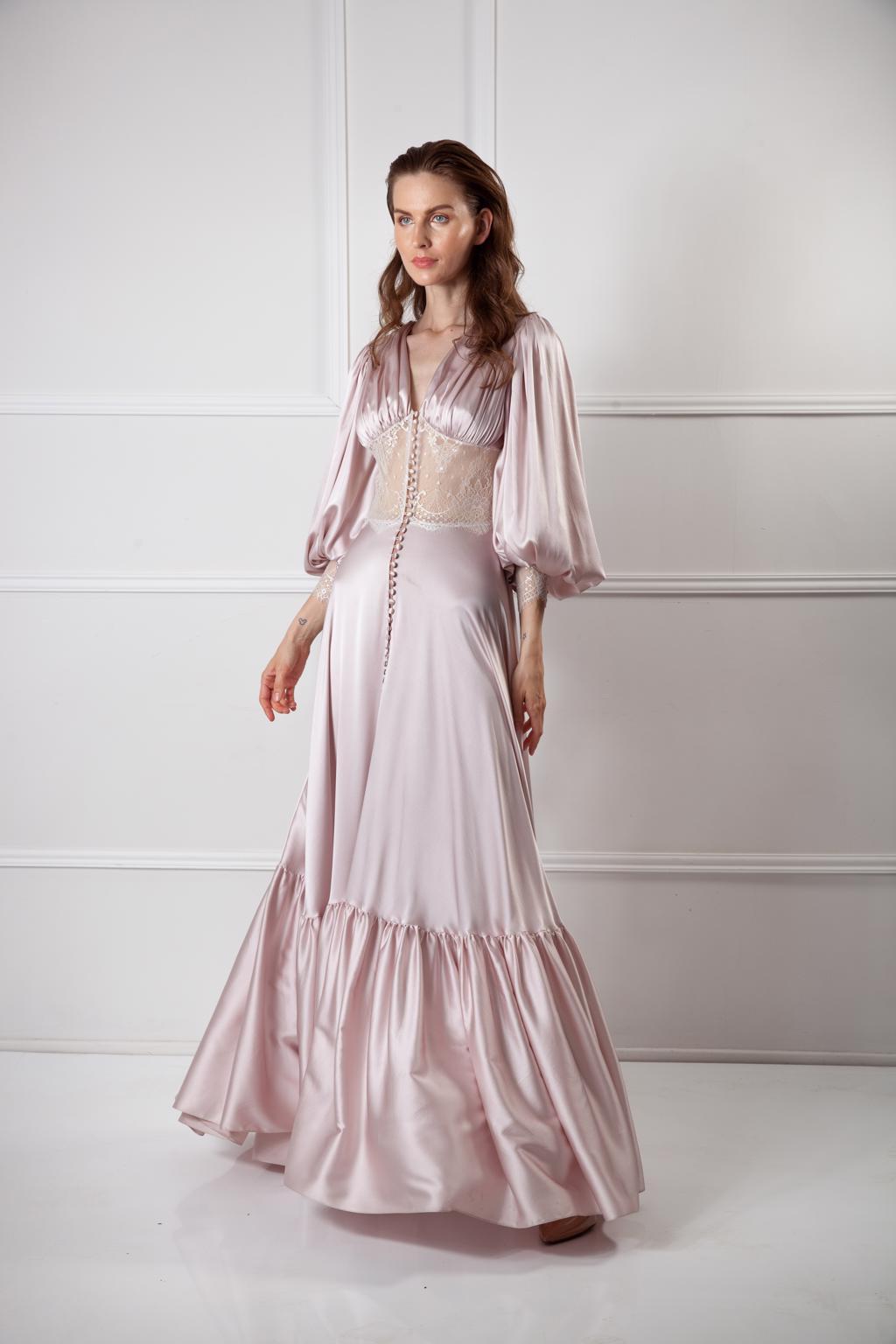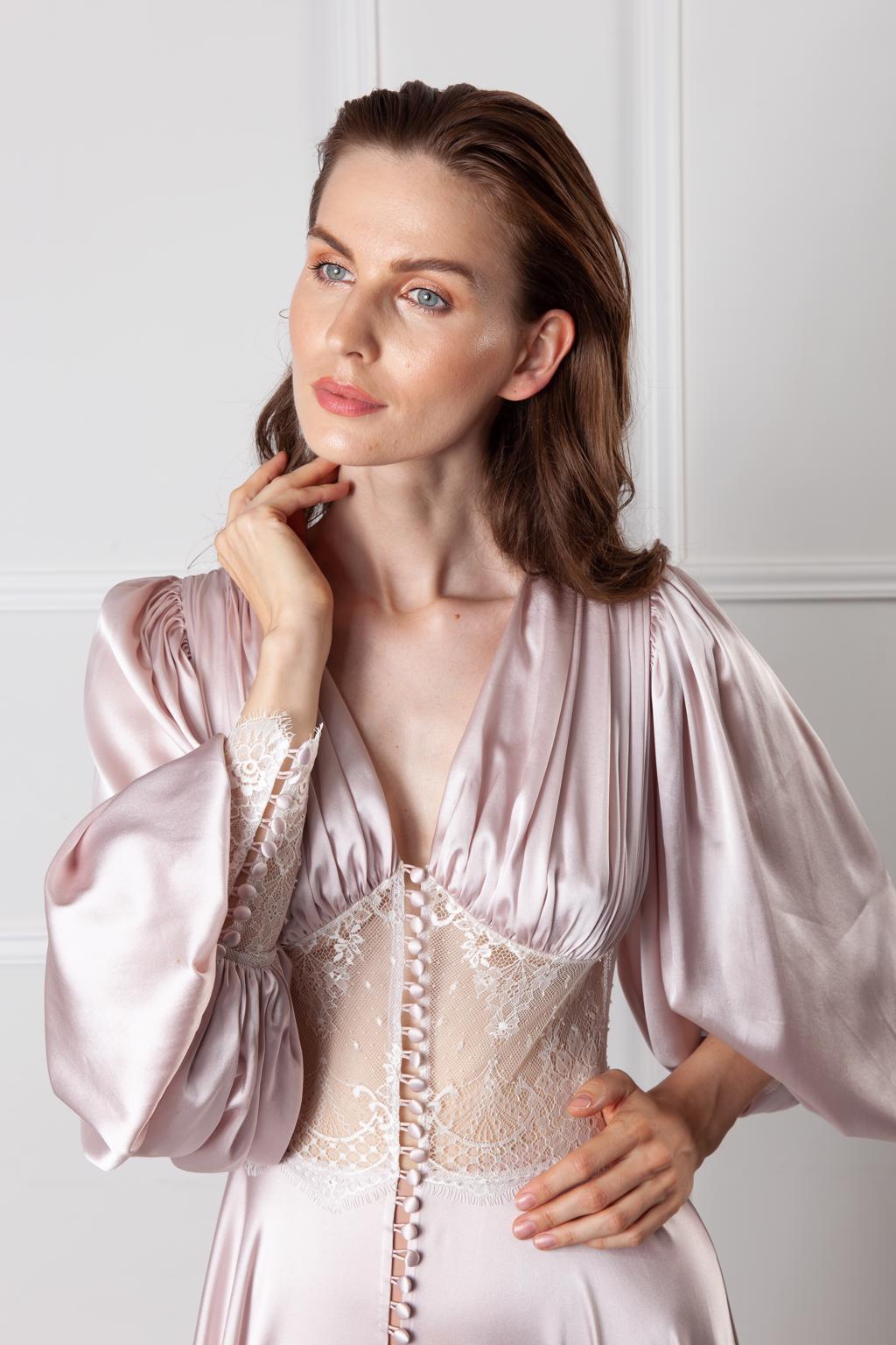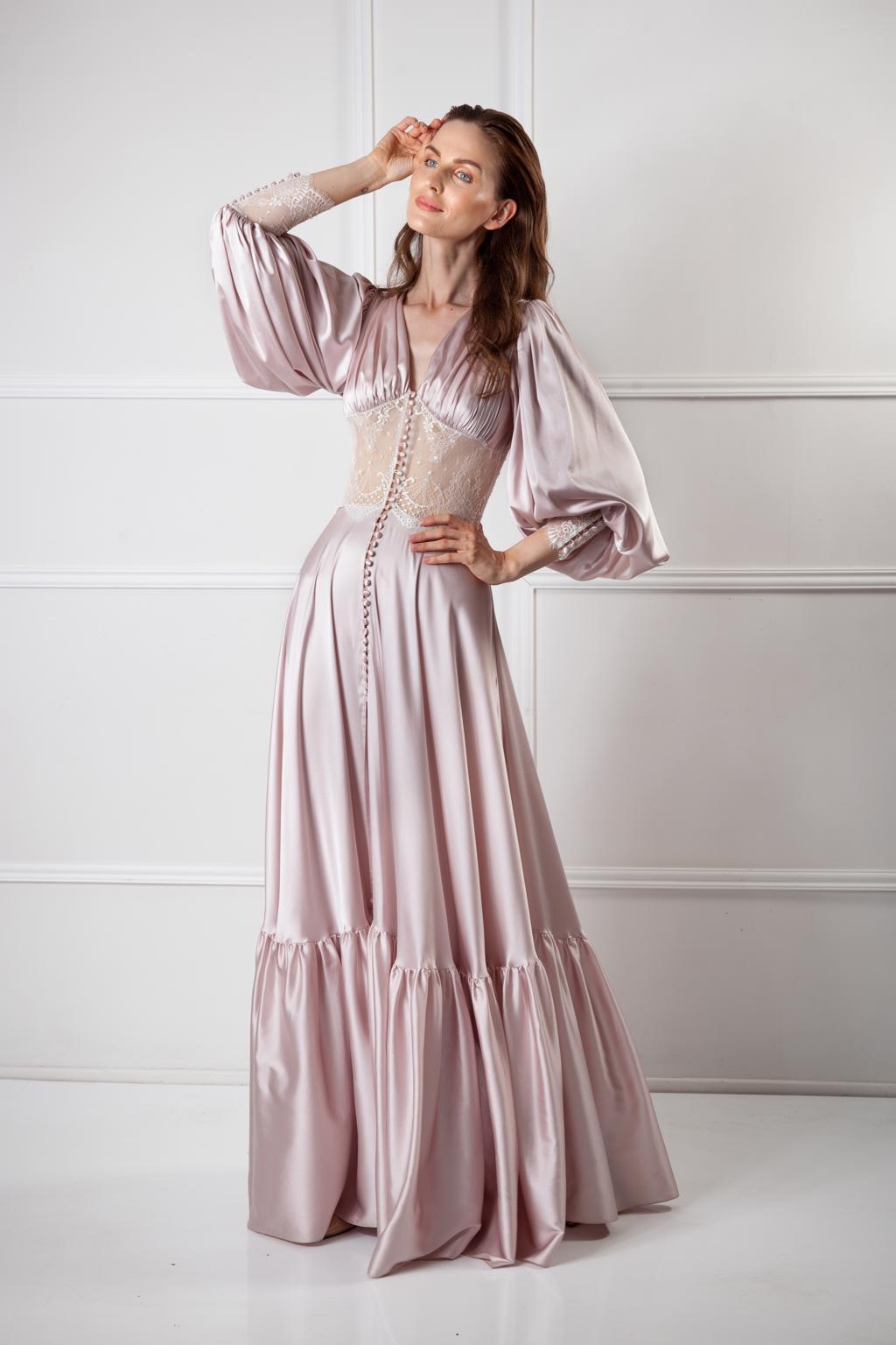 Grezna zīda kleita ar franču mežģīņu detaļām. Greznā zīda maksi kleita ar ekskluzīvām franču mežģīņu detaļām ir jutekliska sievišķīgas garderobes sastāvdaļa. Gan funkcionālas, gan dekoratīvas ar rokām darinātās zīda pogas piešķir elegantu noslēgumu.