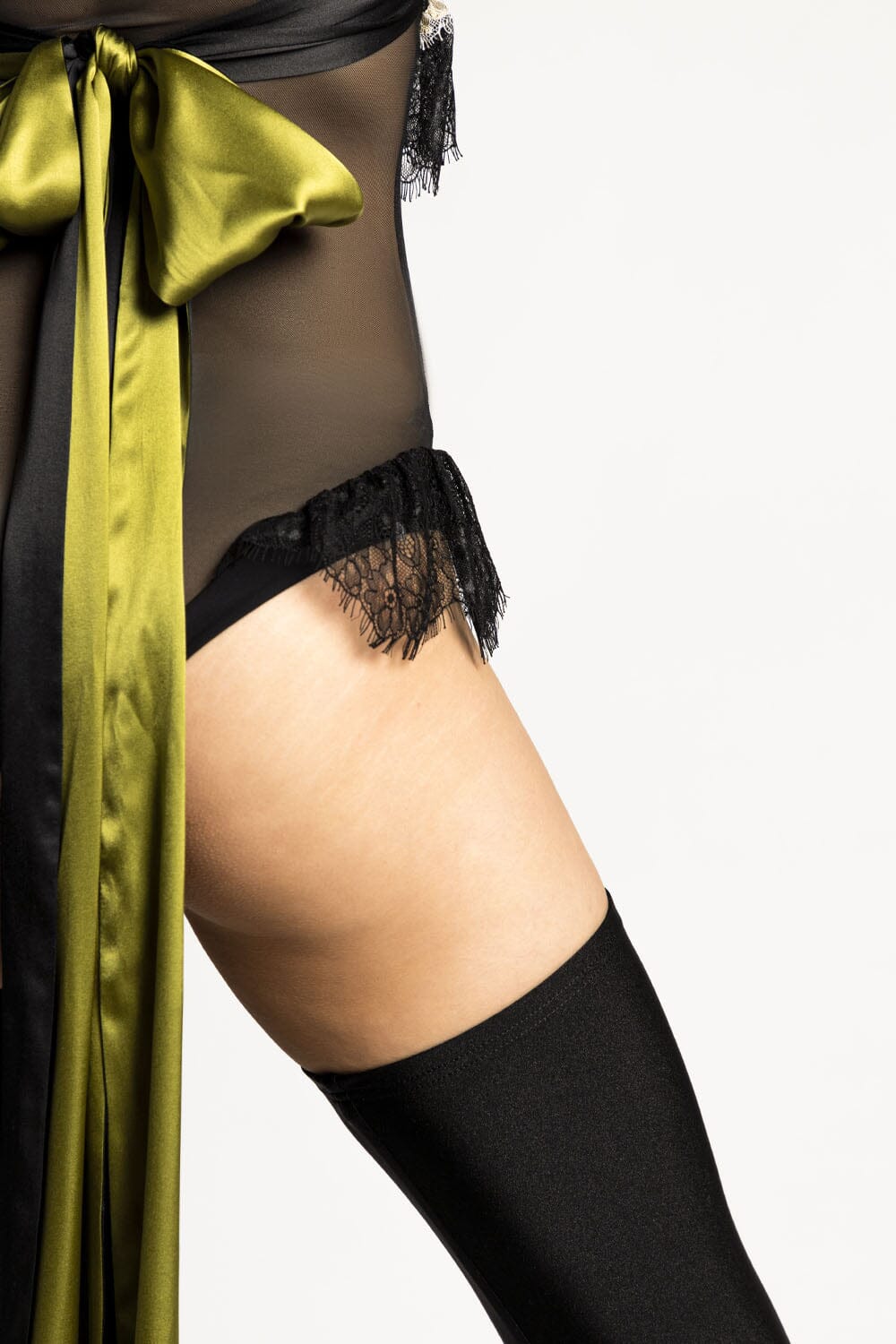 Šim divkrāsainajam mežģīņu bodijam ar dziļu V veida kakla izgriezumu ir balonveida tilla piedurknes ar mežģīņu apdari. Muguras daļa ir caurspīdīga un papildināta ar elegantu zīda banti līdz grīdai. Viduklis izgatavots no ekskluzīva elastīga džersija auduma, kas akcentē figūru.