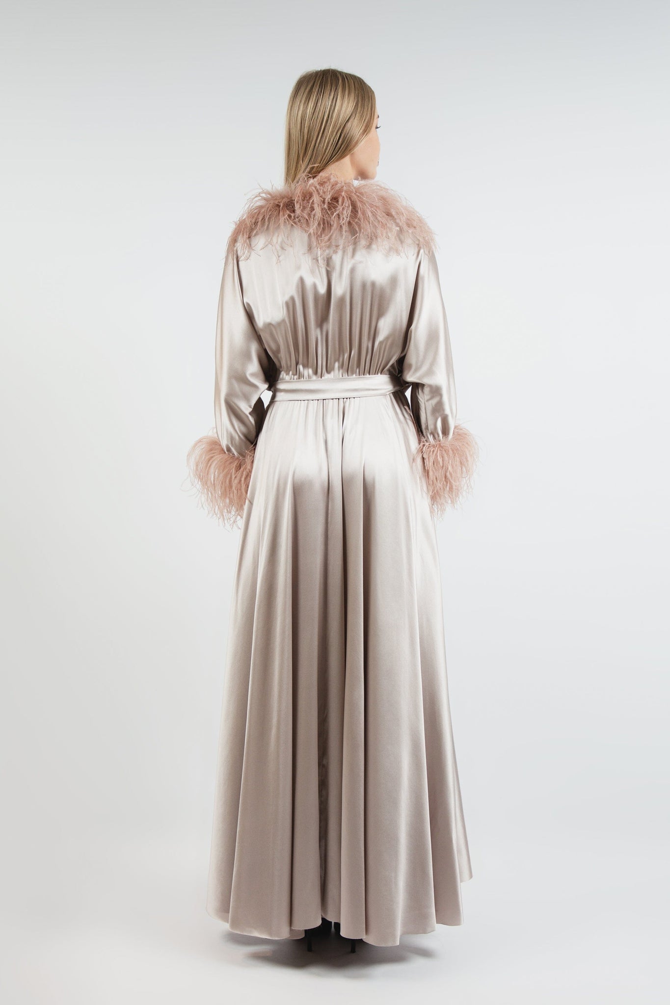 Smalksi bēšs halāts ar rotaļīgām spalvām. Lieliski piemērots īpašiem gadījumiem vai romantiskai atpūtai mājās.