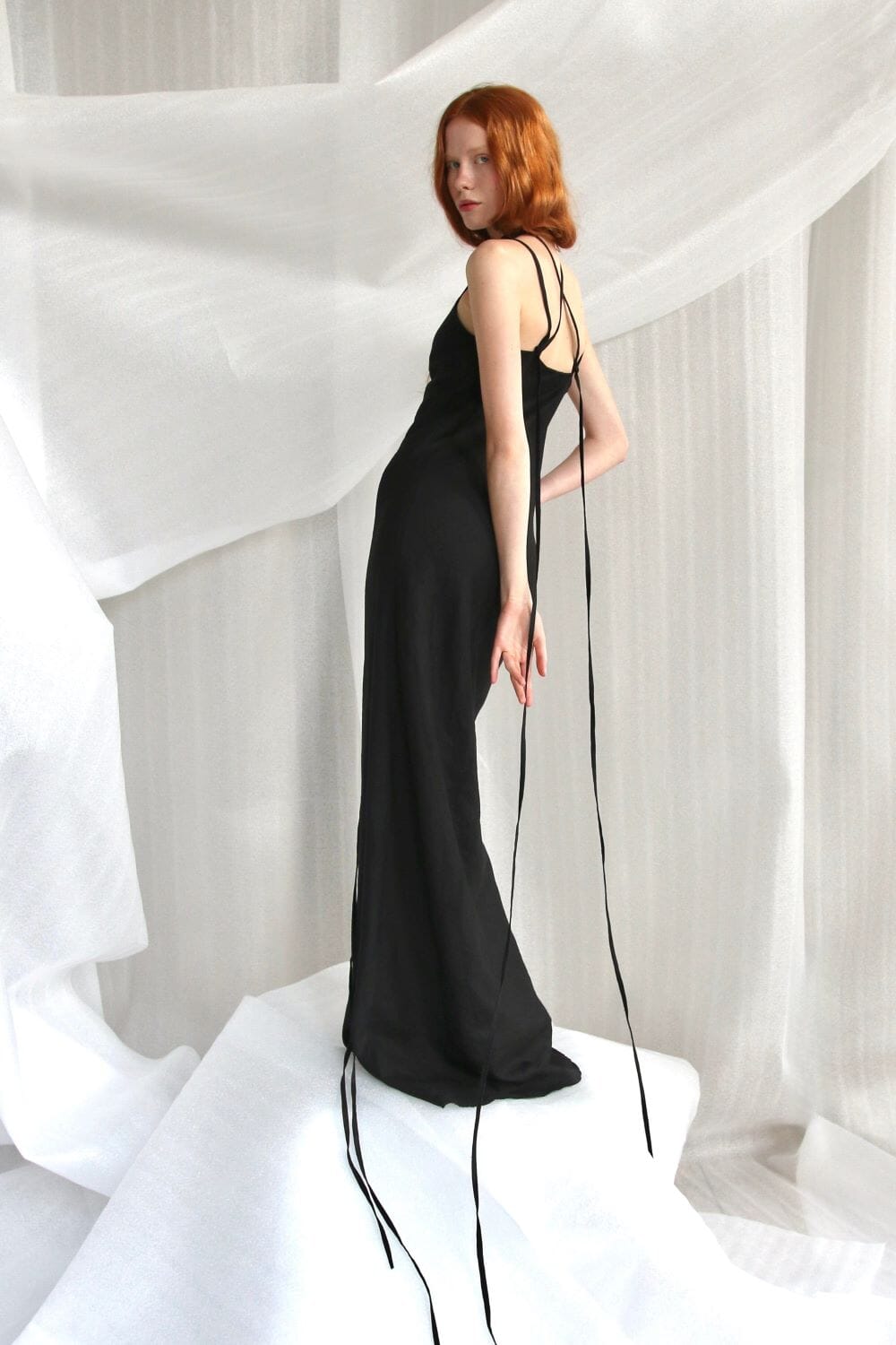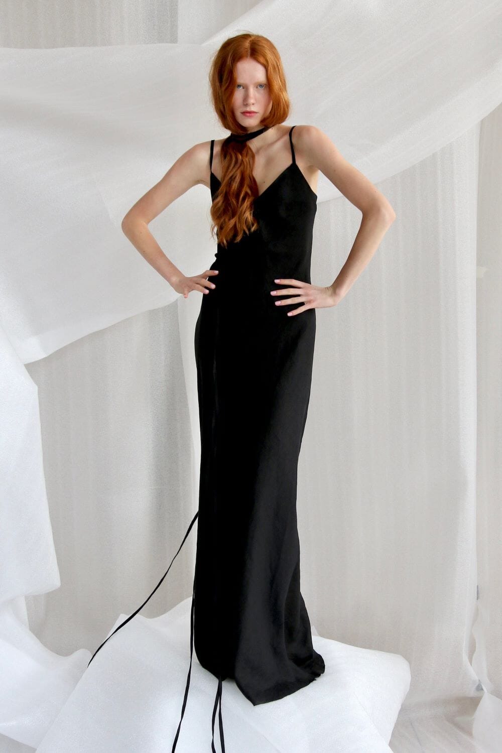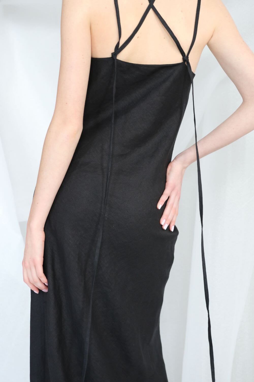 Adorn a silhouette that whispers confidence and a hint of intrigue. The slender lines of the dress promise a graceful poise, while the halter neckline suggests an alluring secret just beneath the surface. The dress is beautifully finished with a raw hemline, enhancing the natural elegance of the linen fabric.