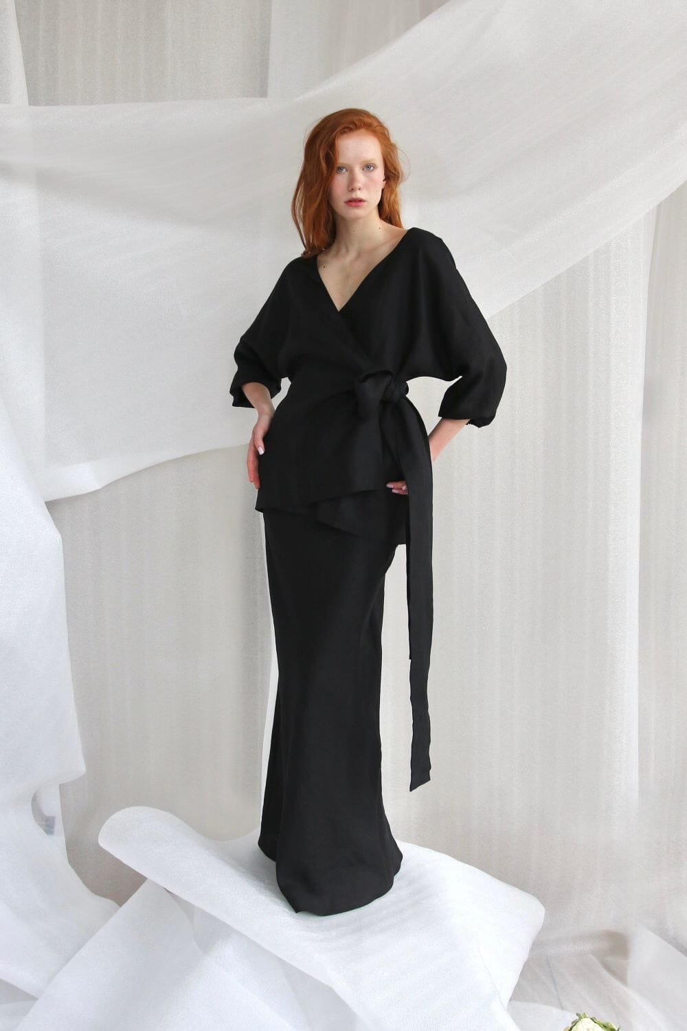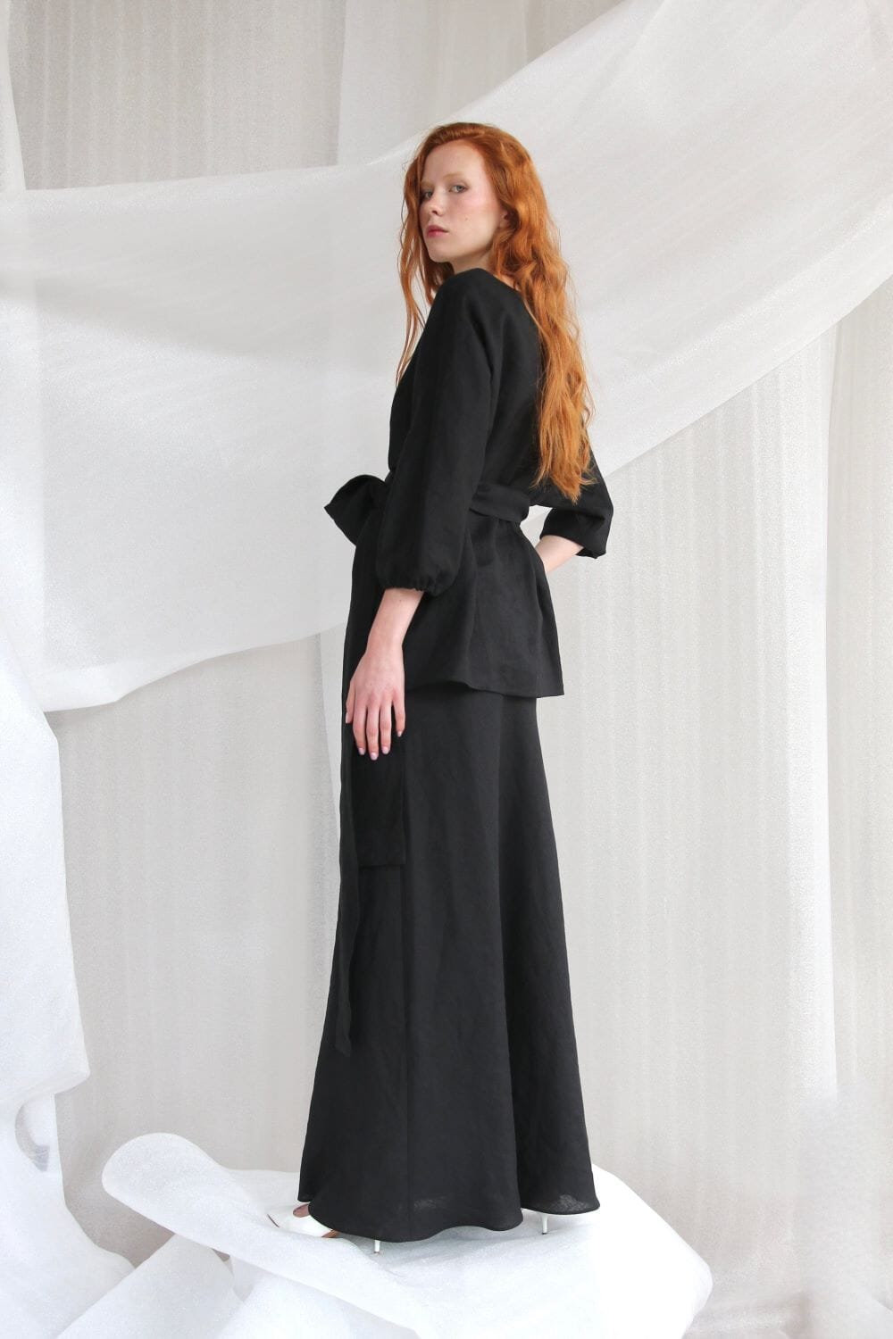 Captivate attention with a black linen ensemble, featuring a kimono-style wrap jacket and a beautifully tailored skirt. The jacket’s design includes pockets for functionality and is cinched at the waist with a broad belt, defining an elegant figure. The skirt matches in comfort and style with an elastic waistband and neatly finished hem, making this ensemble a true testament to poised confidence.